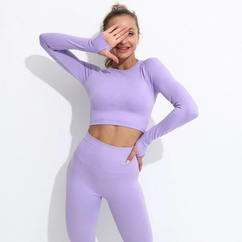 Женский спортивный костюм, бесшовный комплект для йоги, одежда для спортзала, фитнеса, спортивная одежда, короткий топ с длинным рукавом, рубашки, леггинсы для бега с высокой талией