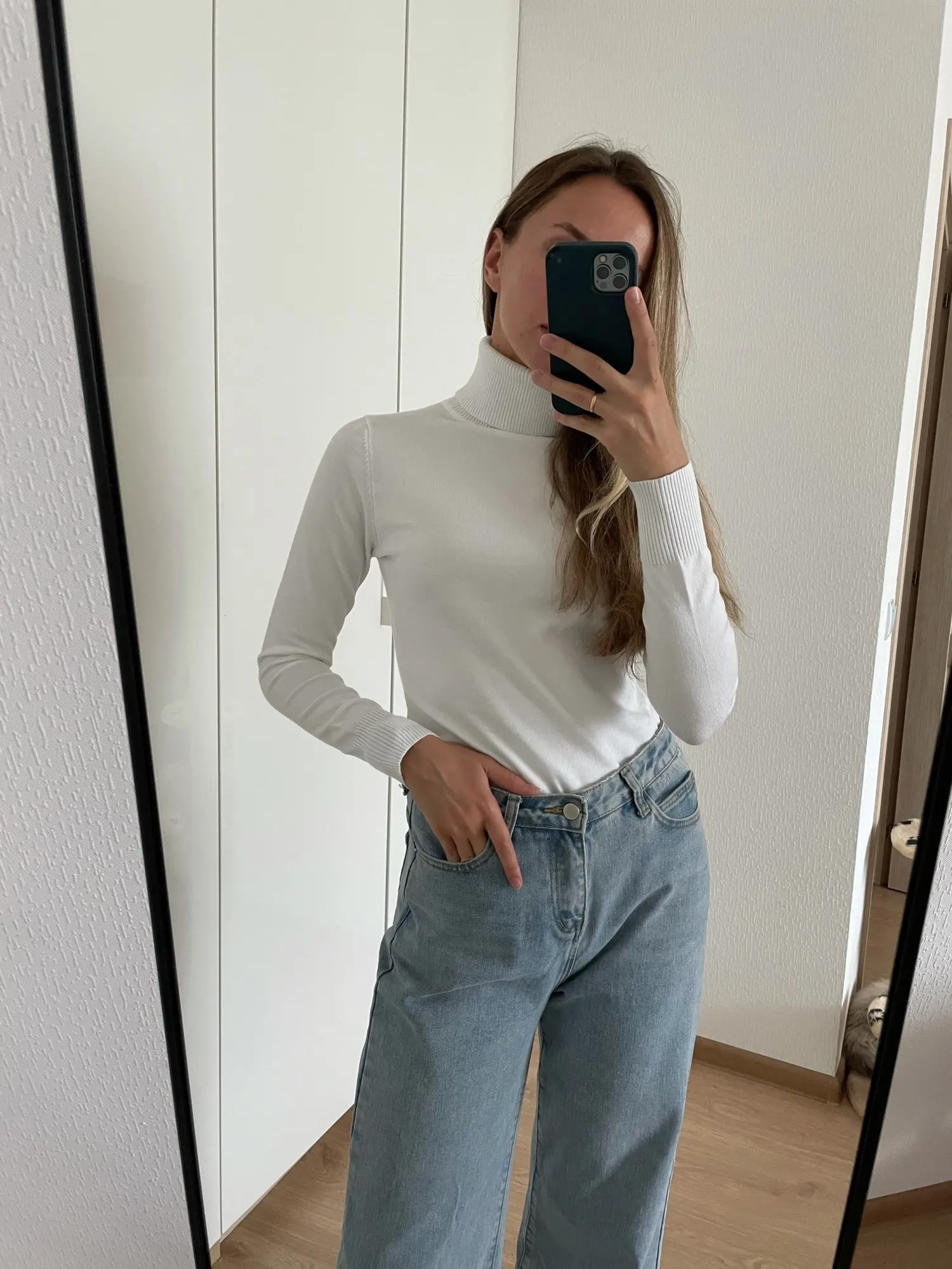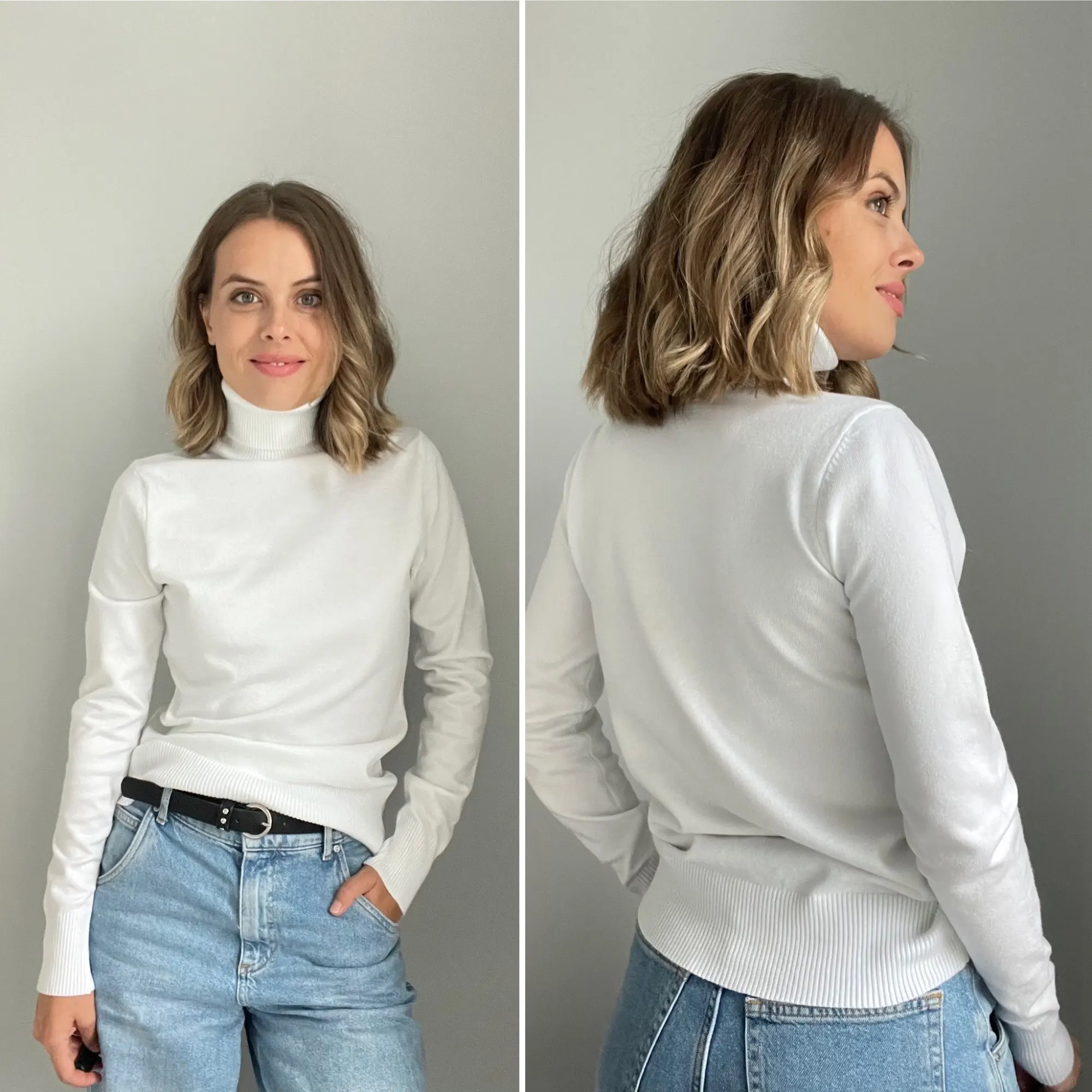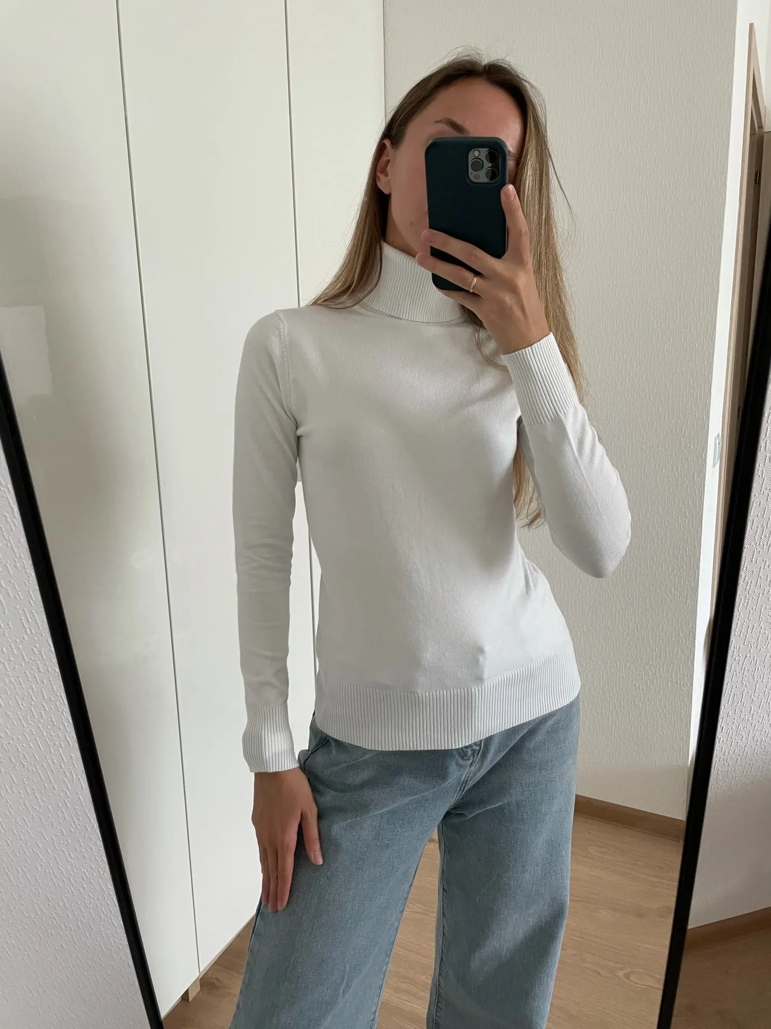 Базовая водолазка на каждый день Мои параметры: 84-66-95 и рост 172 см. Размер единый сидит чуть свободно Оттенок белоснежный. Материал, на мой взгляд, синтетический. На теле комфортен. Достаточно плотный. Носить с телесным бельем Доставка в Петербург заняла 2,5 недели