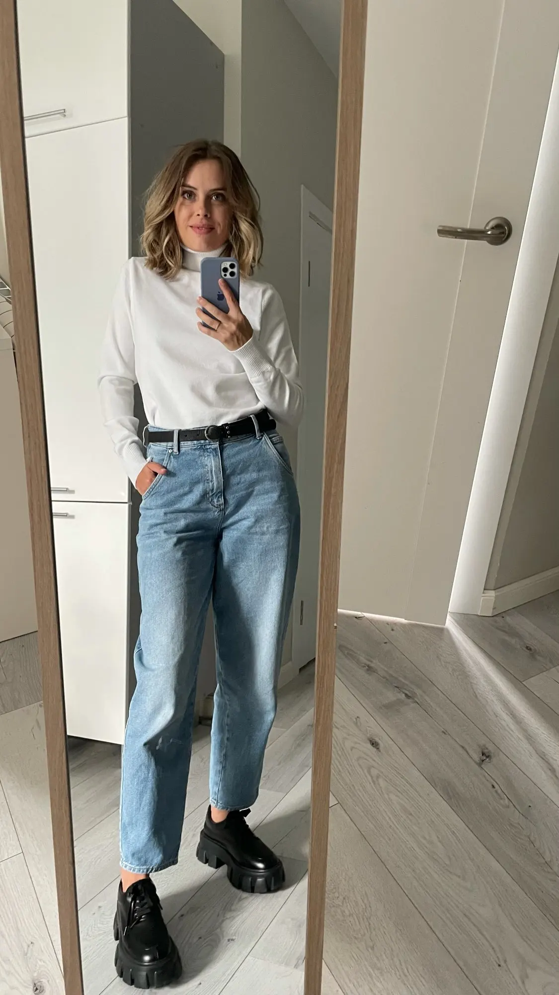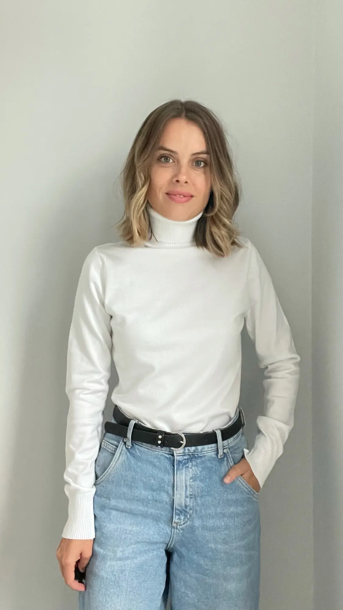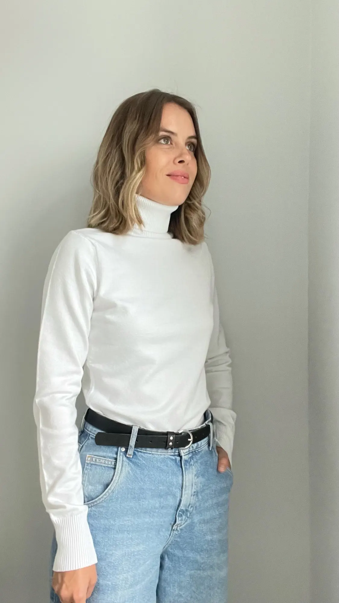Базовая водолазка на каждый день Мои параметры: 84-66-95 и рост 172 см. Размер единый сидит чуть свободно Оттенок белоснежный. Материал, на мой взгляд, синтетический. На теле комфортен. Достаточно плотный. Носить с телесным бельем Доставка в Петербург заняла 2,5 недели