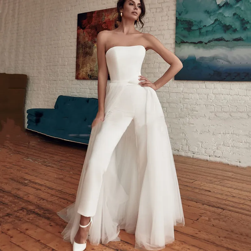 Женский атласный комбинезон без бретелек, с открытыми плечами, без рукавов, со съемным шлейфом, белые свадебные Брюки, 2021