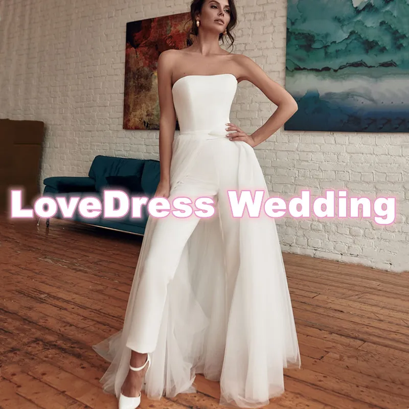 Женский атласный комбинезон, без бретелек, с открытыми плечами, без рукавов, со съемным шлейфом, белые свадебные брюки в стиле бохо, 2021