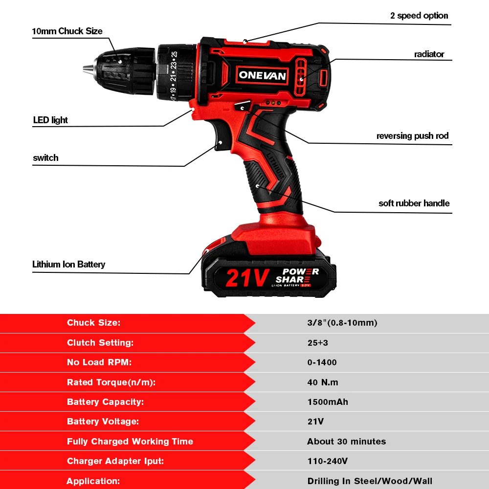 -Сверхмощная беспроводная дрель, обеспечивает до 25Н. М крутящего момента и 1450 об/мин скорости.