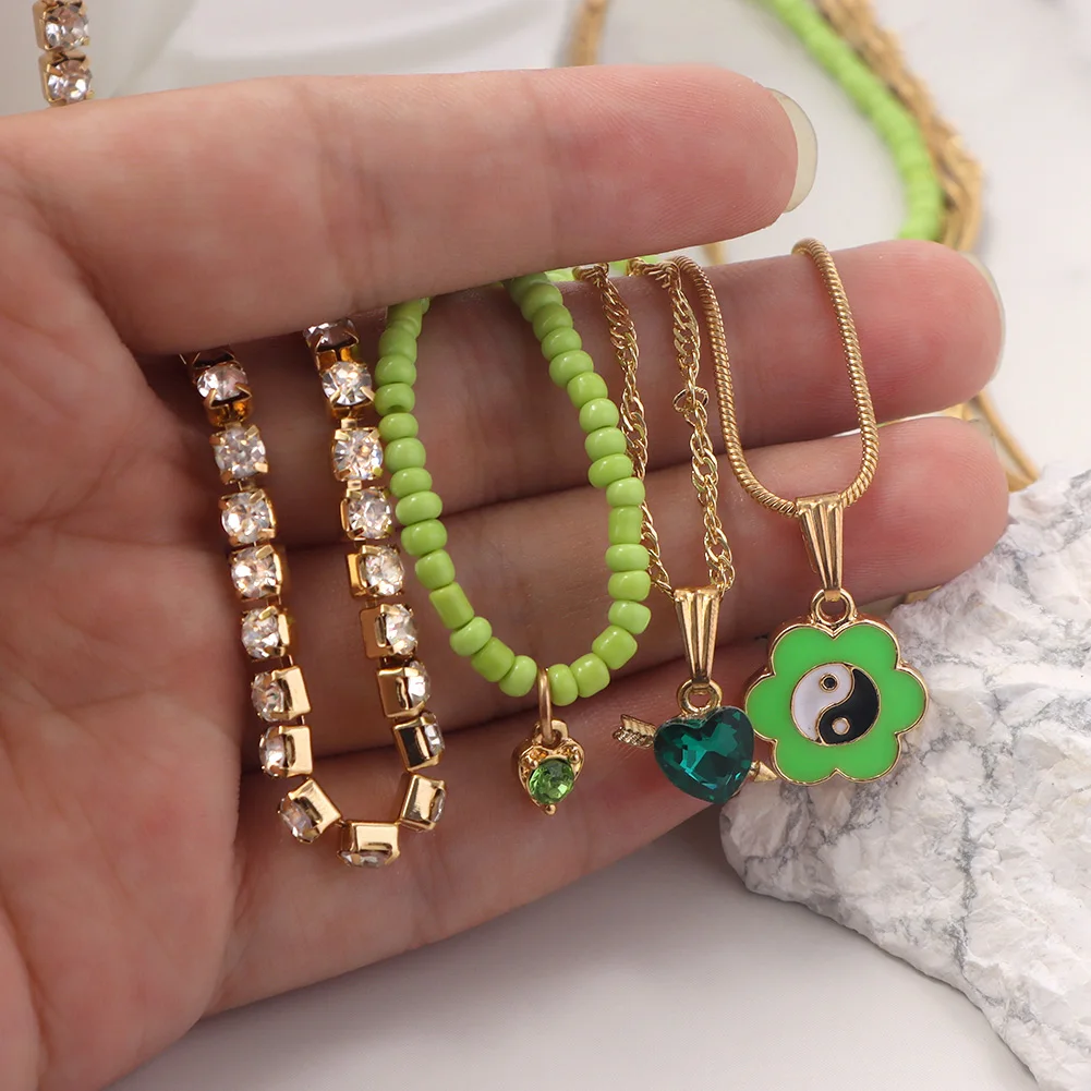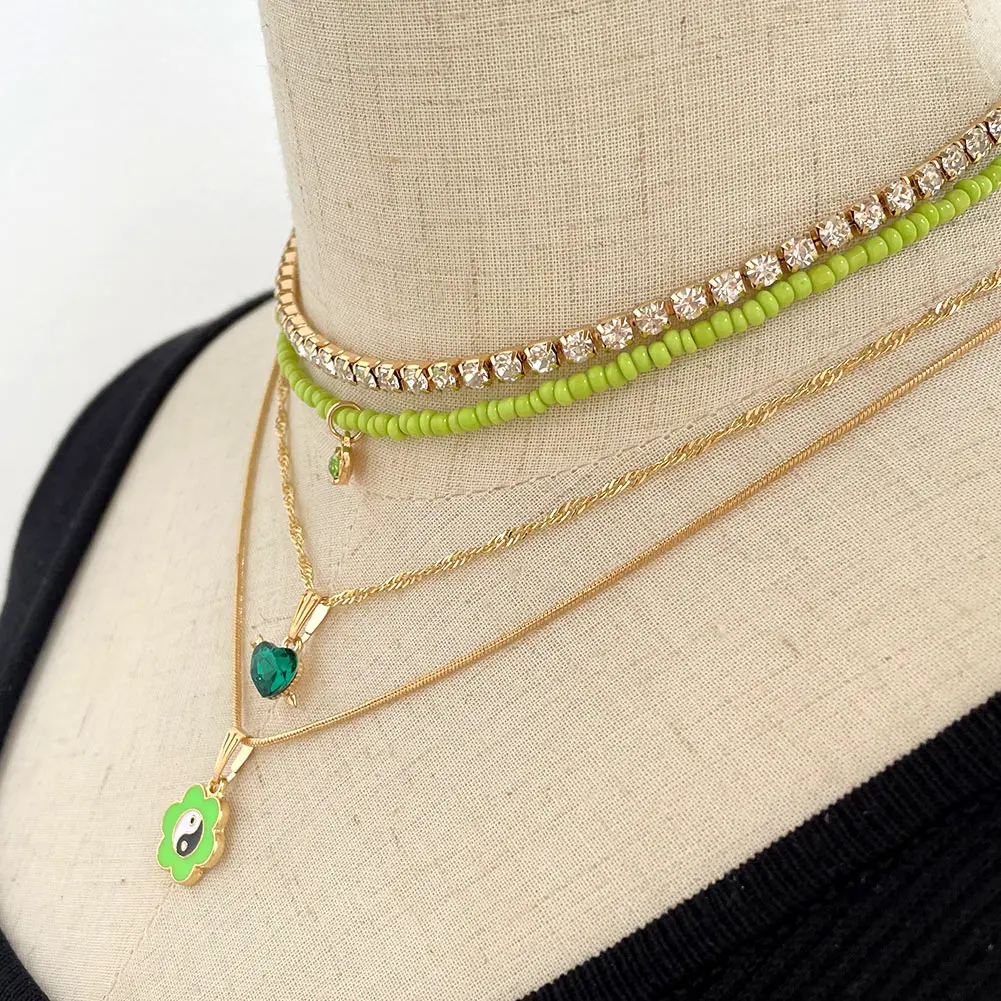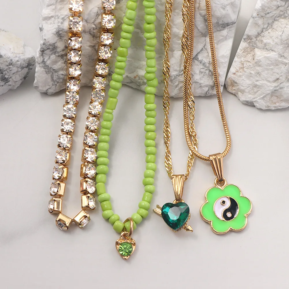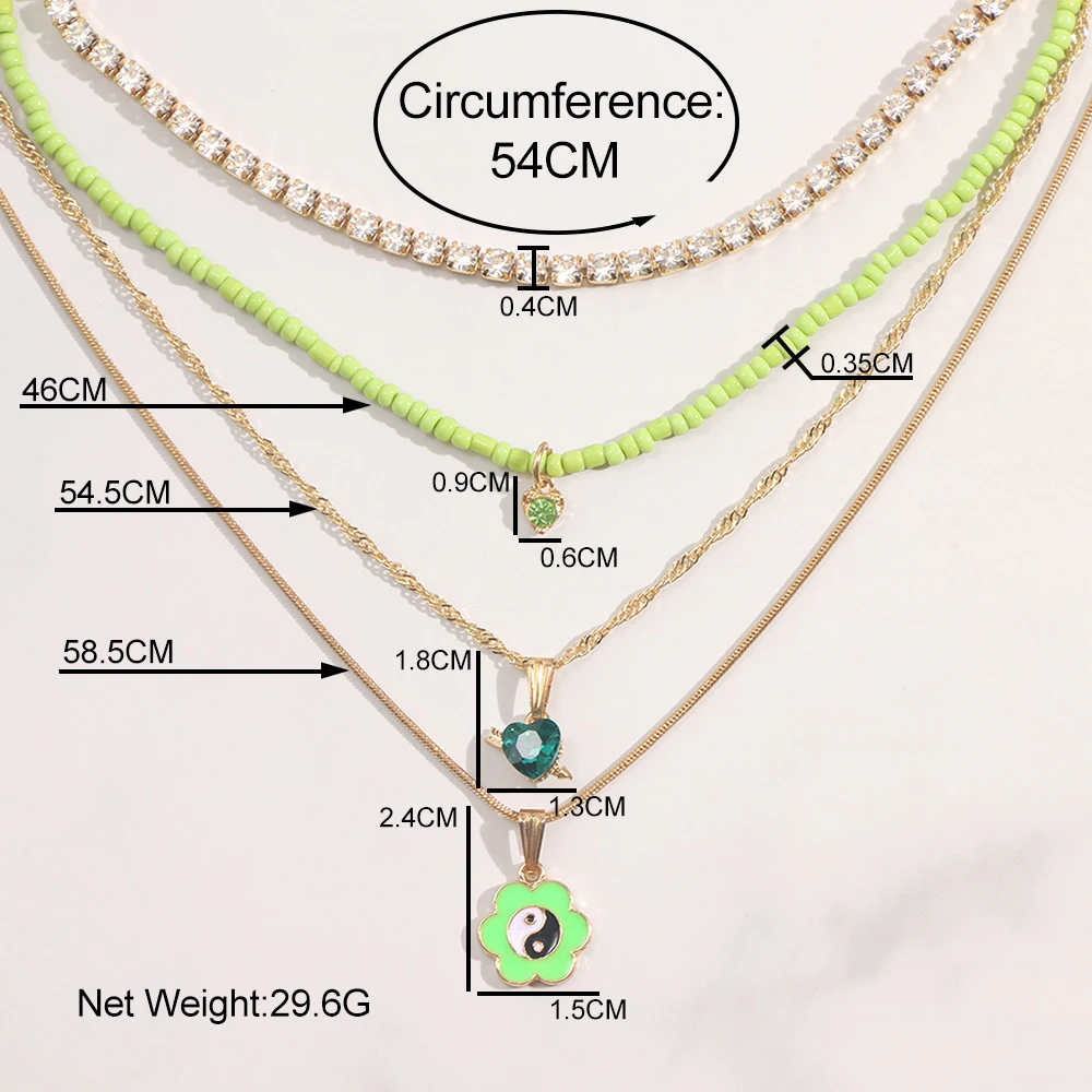 Очаровательное колье с зелеными кристаллами в форме сердца, рисовые бусины, многослойные, в стиле бохо глянцевые цветы, ключицы ожерелья цепи для женщин, летние украшения