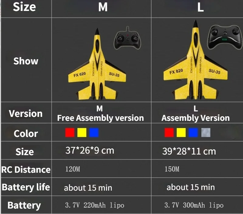 Описание:1. Это Flybear FX-820 самолет с 2CH 2,4 ГГц передача сигнала.2. Изготовлен из высококачественного прочного EPP, который делает его светильник.3. С высоким крутящим моментом и мощным двигателем, это принесет вам прекрасный опыт.4. Доступны два разных варианта размеров, большой размер 39*28*11 см, средний размер 37*26*9 см.Характеристики:Название: RC самолетМодель: FX-820Материал: Прочный EPPПульт дистанционного управления: 2,4G 2CHВремя полета: 15-20 минутВремя зарядки: около 35 минСамолет Батарея: 3,7 V 300mAh литий-полимерный аккумулятор (встроенный)Расстояние дистанционного управления: 120-150 мАккумулятор передатчика: 3 батареи AA (не входят в комплект)Большой размер: Wingspan-28cm Length-39cm Height-11cmСредний размер: Wingspan-26cm Length-37cm Height-9cmОсобенности:1. Имитирует классические военные самолеты SU-352. Материал: Изготовлен из высококачественного прочного EPP, который делает его светильник.3. Простота сборки: быстрая и простая сборка4. 2,4 ГГц Управление: сильный анти-помех передачи, позволяя ему вождения на дальние расстояния. 5. Высокая производительность: высокий крутящий момент и мощный двигательПосылка:1 x RC самолет, 1x3,7 V 300mAh Lipo батарея (встроенный), 1 x пульт дистанционного управления, 1 x USB зарядное устройство, 1 x руководство на английском языкеПримечание:1. Фактический цвет может быть s светильник, который сильно отличается от изображения из-за различных эффектов монитора и светильник.2. Возможны отклонения на 1-3 см вследствие измерений вручную.2.Посылка не содержит батареек, пожалуйста, возьмите с собой 3 батарейки АА.