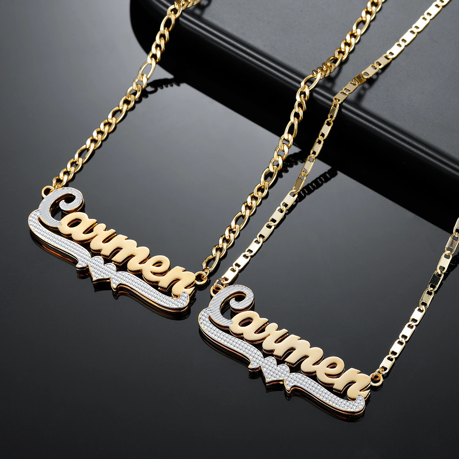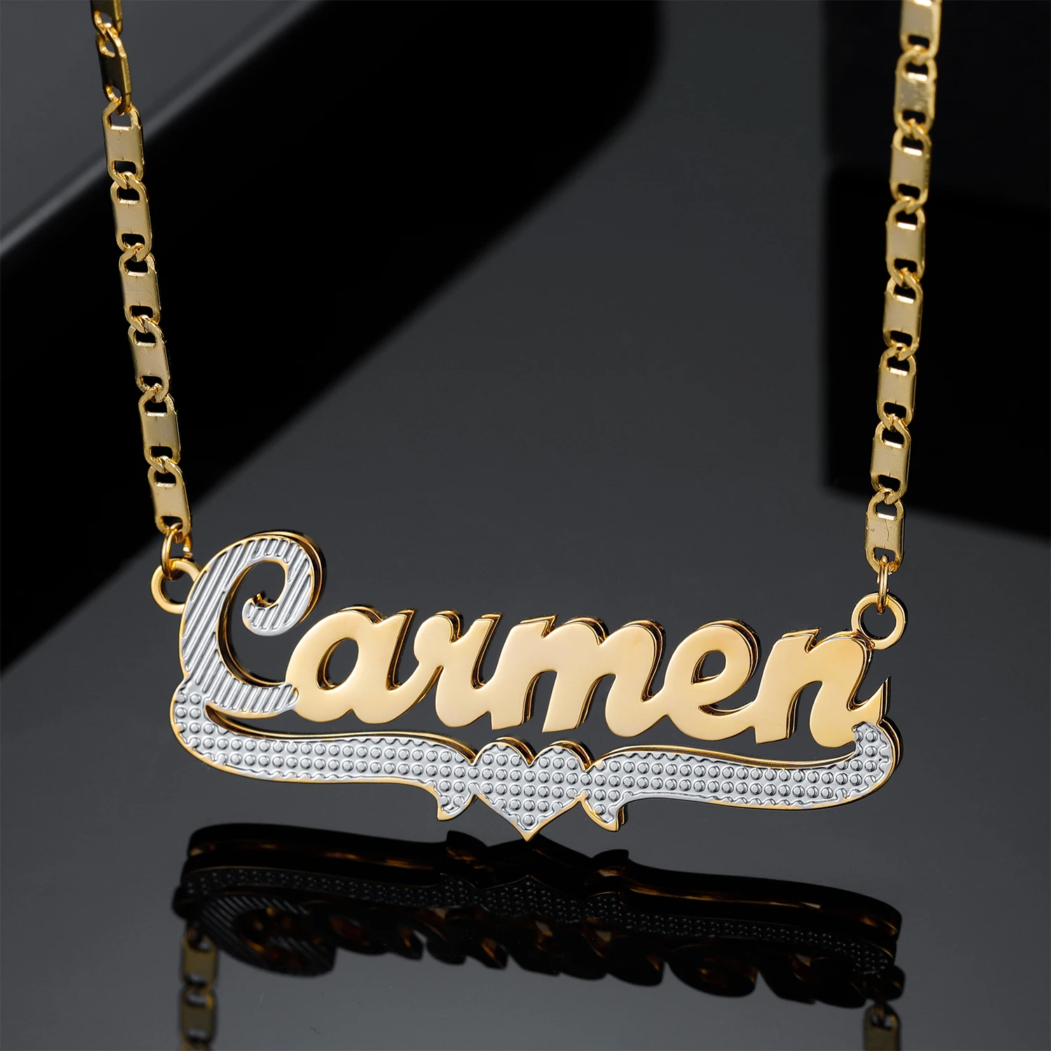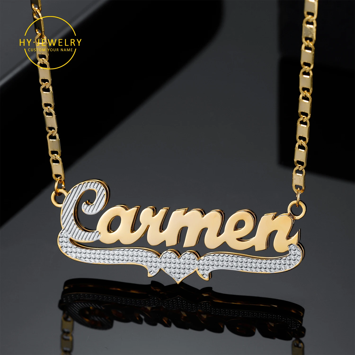 Двухцветное ожерелье с именем, покрытое золотом 18 карат, персонализированная двойная пластина 3D цепочки с кулонами с именами с сердцем, ювелирные изделия из нержавеющей стали на заказ