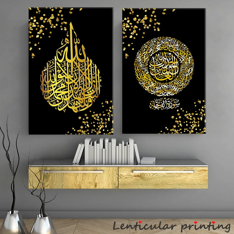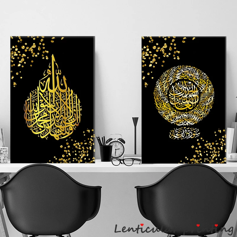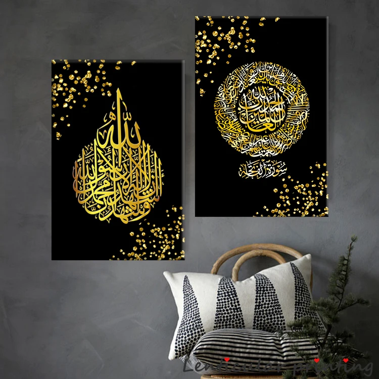 Золотая Роскошная арабская каллиграфия, исламский холст, масляная живопись, настенное искусство, мусульманский декор для гостиной, Черное и Золотое искусство, 2 шт.