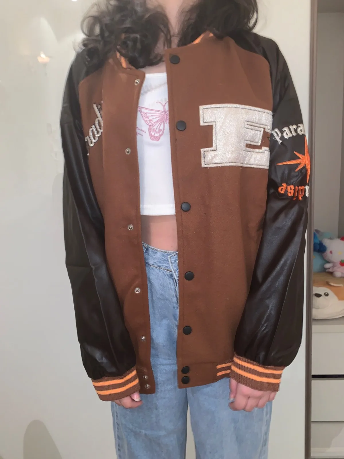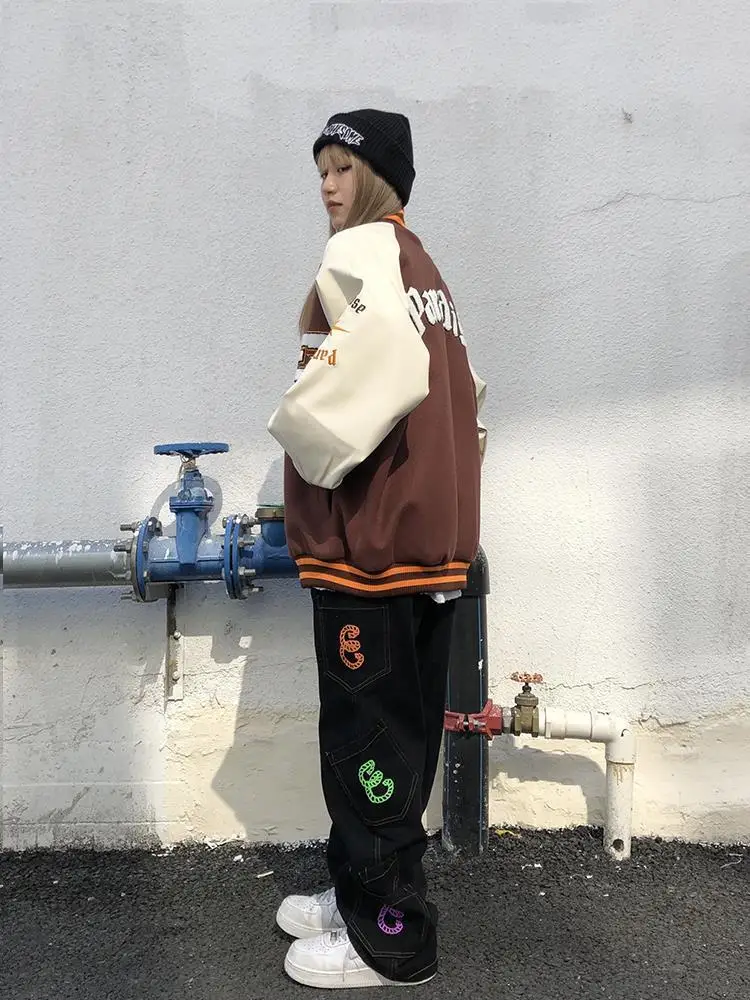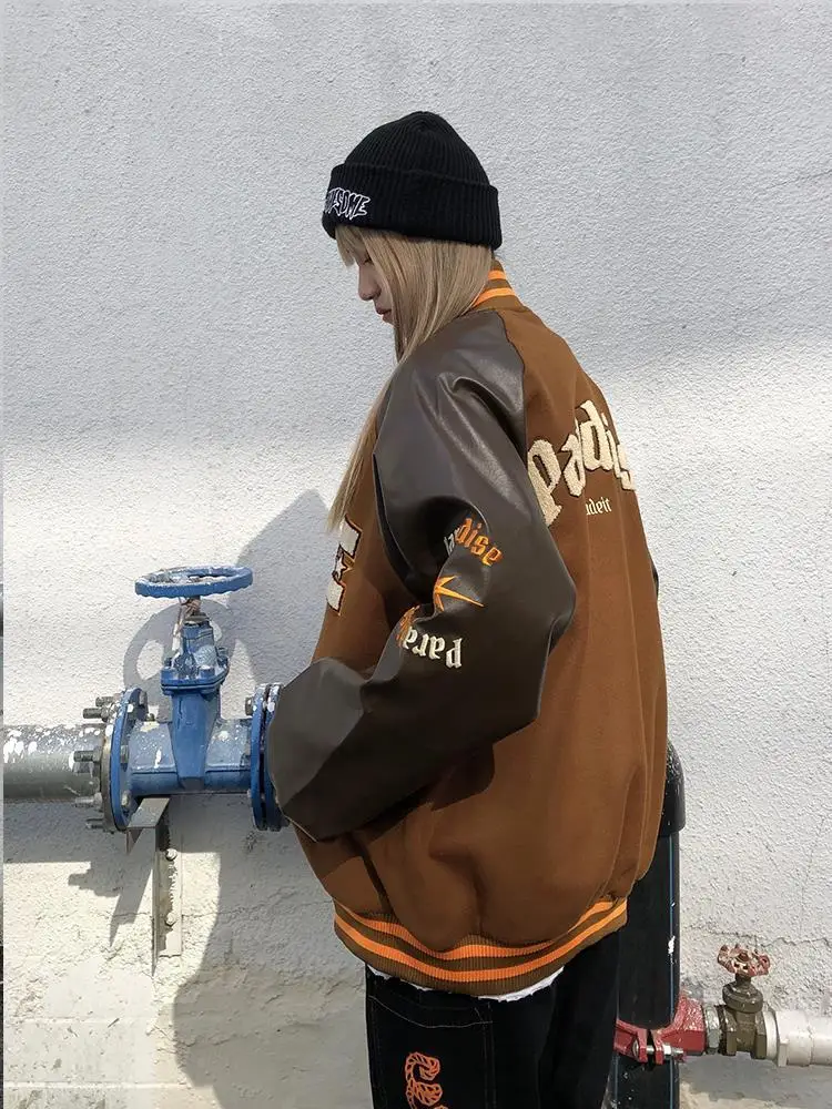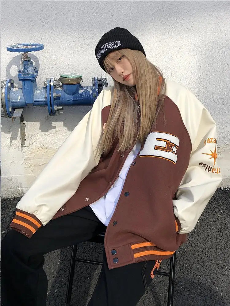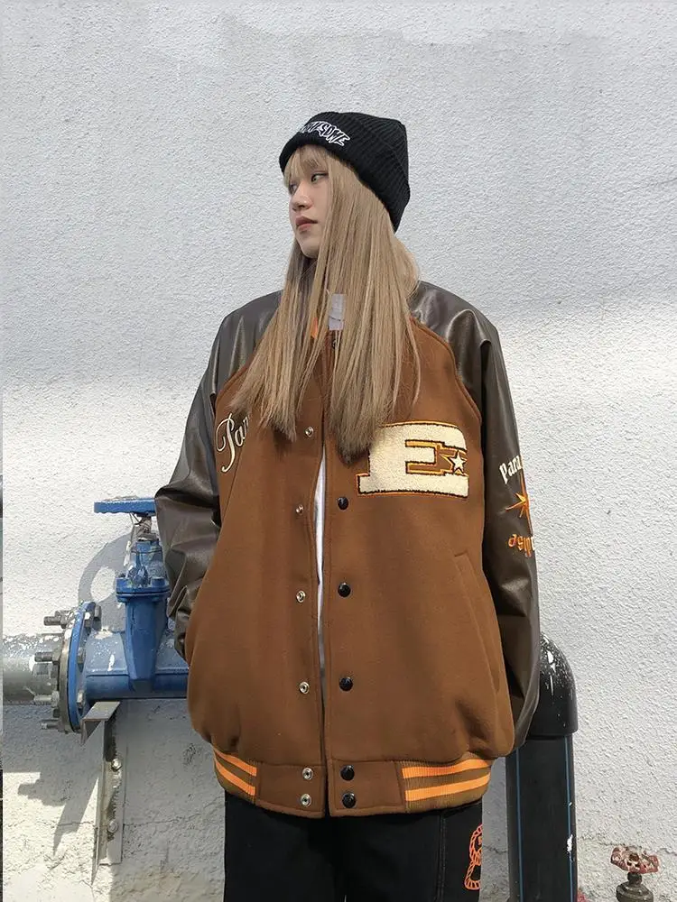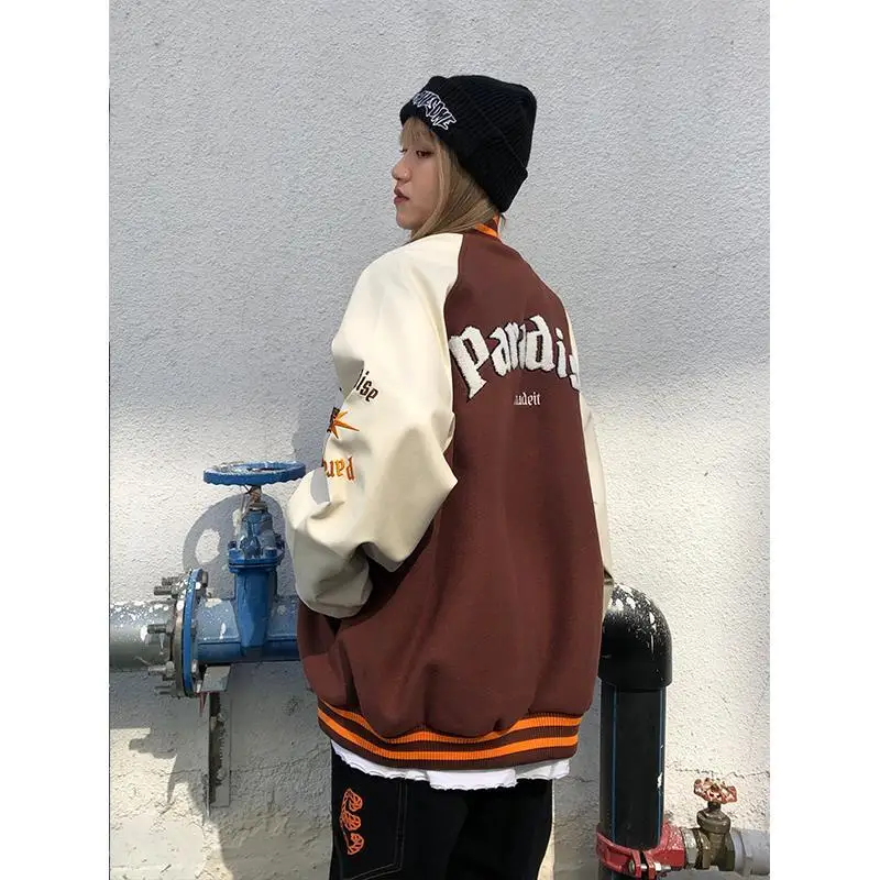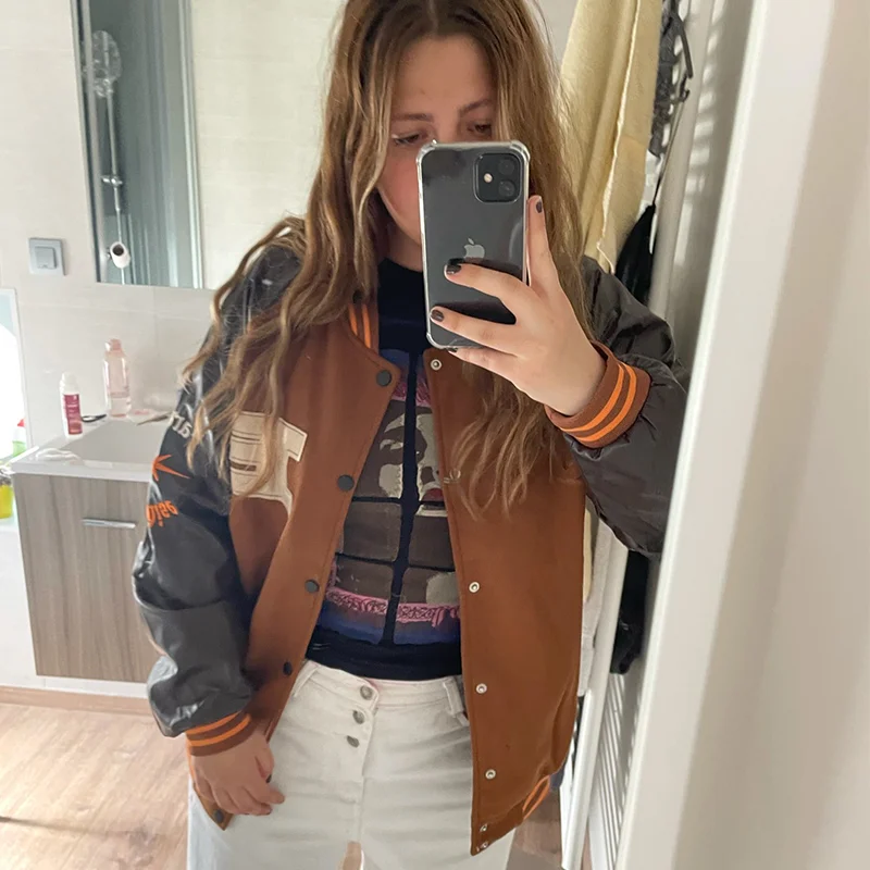 Куртка в стиле Харадзюку, коричневая бейсбольная куртка-бомбер, Жен...