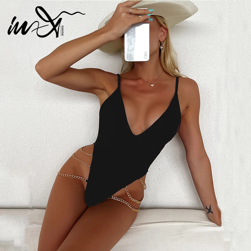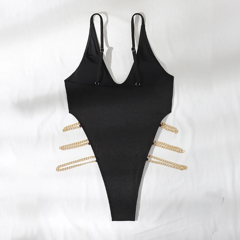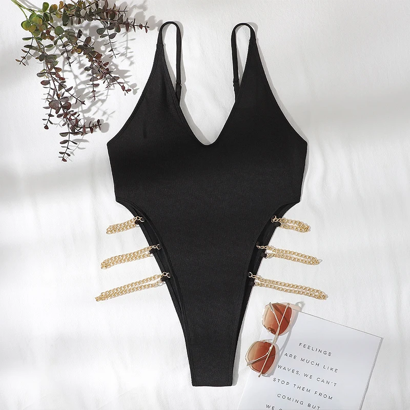 Цельный купальник с цепочкой In-X, женский купальник с цепочкой, Женский монокини с вырезами, однотонный купальный костюм, боди, пляжная одежда 2021 в рубчик