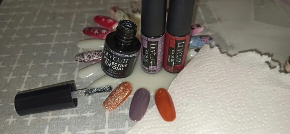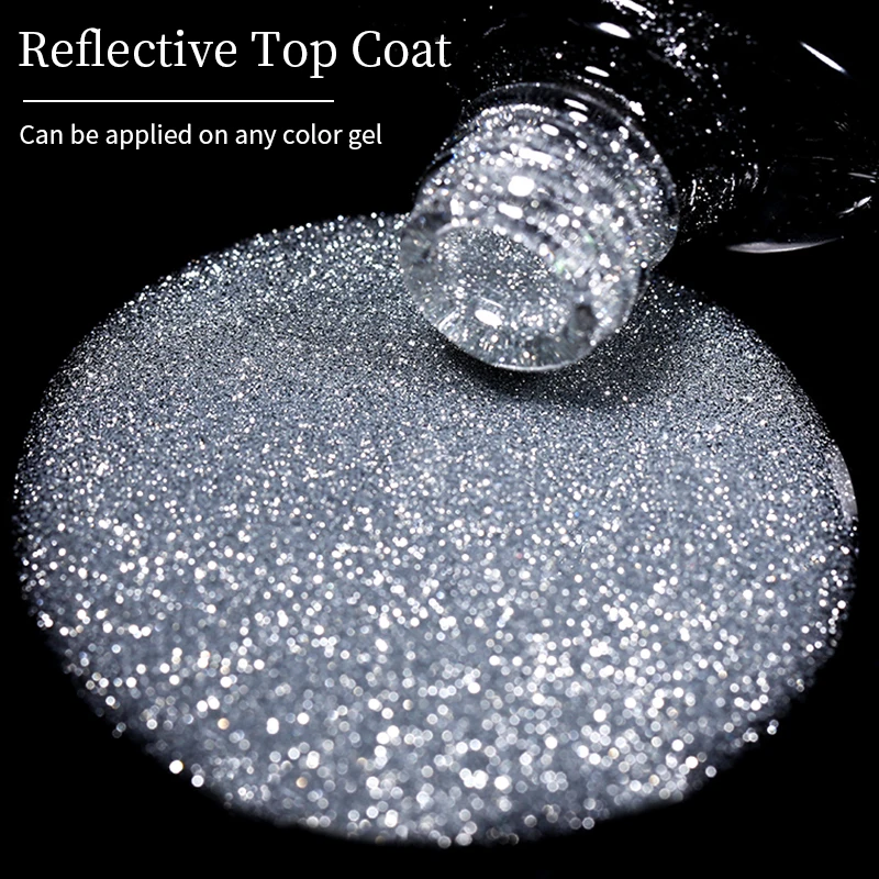 Это топ, наносится поверх гель лака и затвердевает в уф/лед лампе. Липкого слоя не имеет. Отражает свет только в свете вспышки, фар или фонарика например. При обычном освещении его почти не видно.