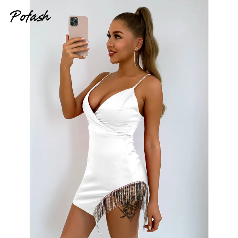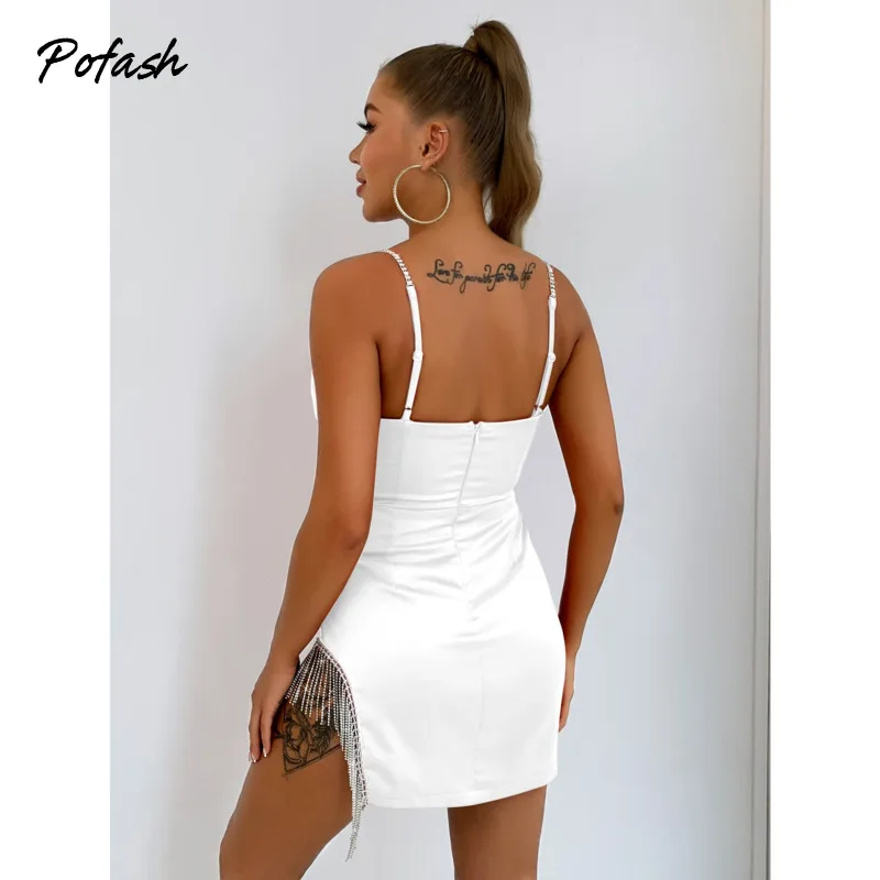 Атласное белое Летнее мини-платье Pofash для женщин с глубоким V-образным вырезом и бриллиантами, Сексуальные клубные вечерние платья с открытой спиной 2021, женские облегающие платья