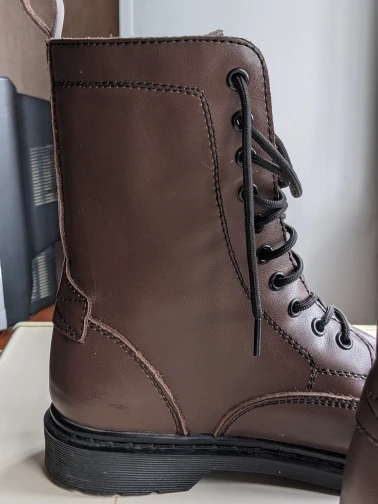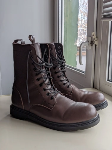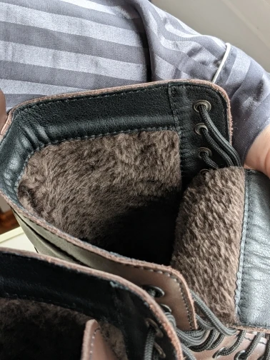 Материал похож на кожу, достаточно толстый. На срезе видно. Есть только шнурки, без молний. Единственное, что не понравилось, что в описании продавца мех - овчина, на самом деле тонковатый слой плюша. На стопу 27.5 заказали 45 размер. Свободный, с шерстяным носком самое то. Пришли быстро, недели за две в Казань.