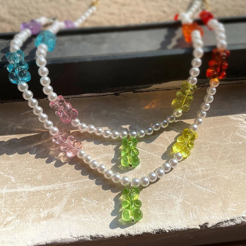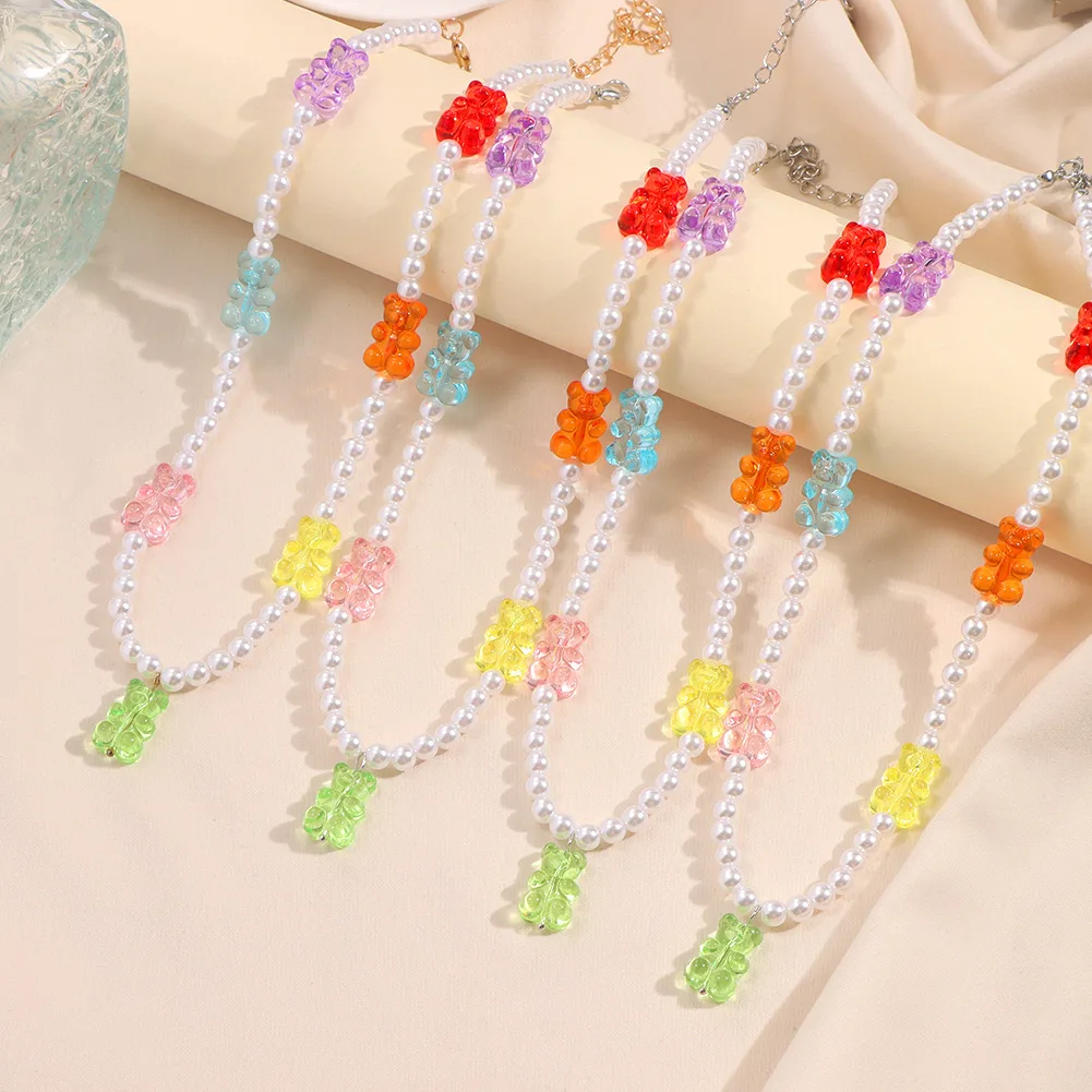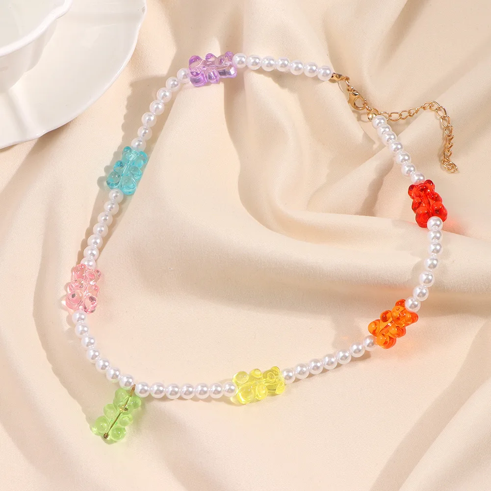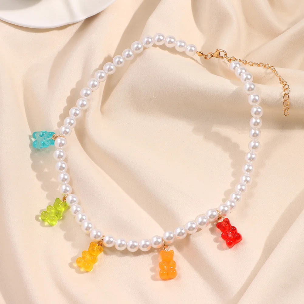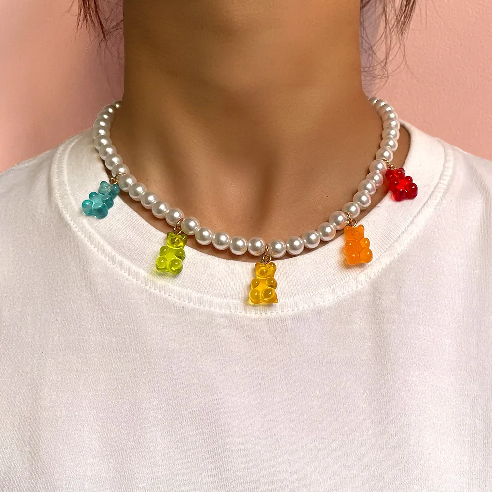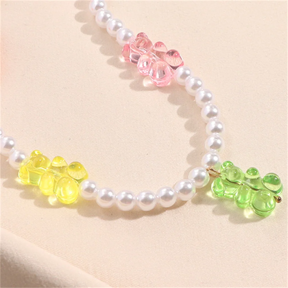 Ожерелье-чокер Y2k женское с жемчужными бусинами, цветной кулон в виде мишки-желе с бисером ручной работы, корейская бижутерия