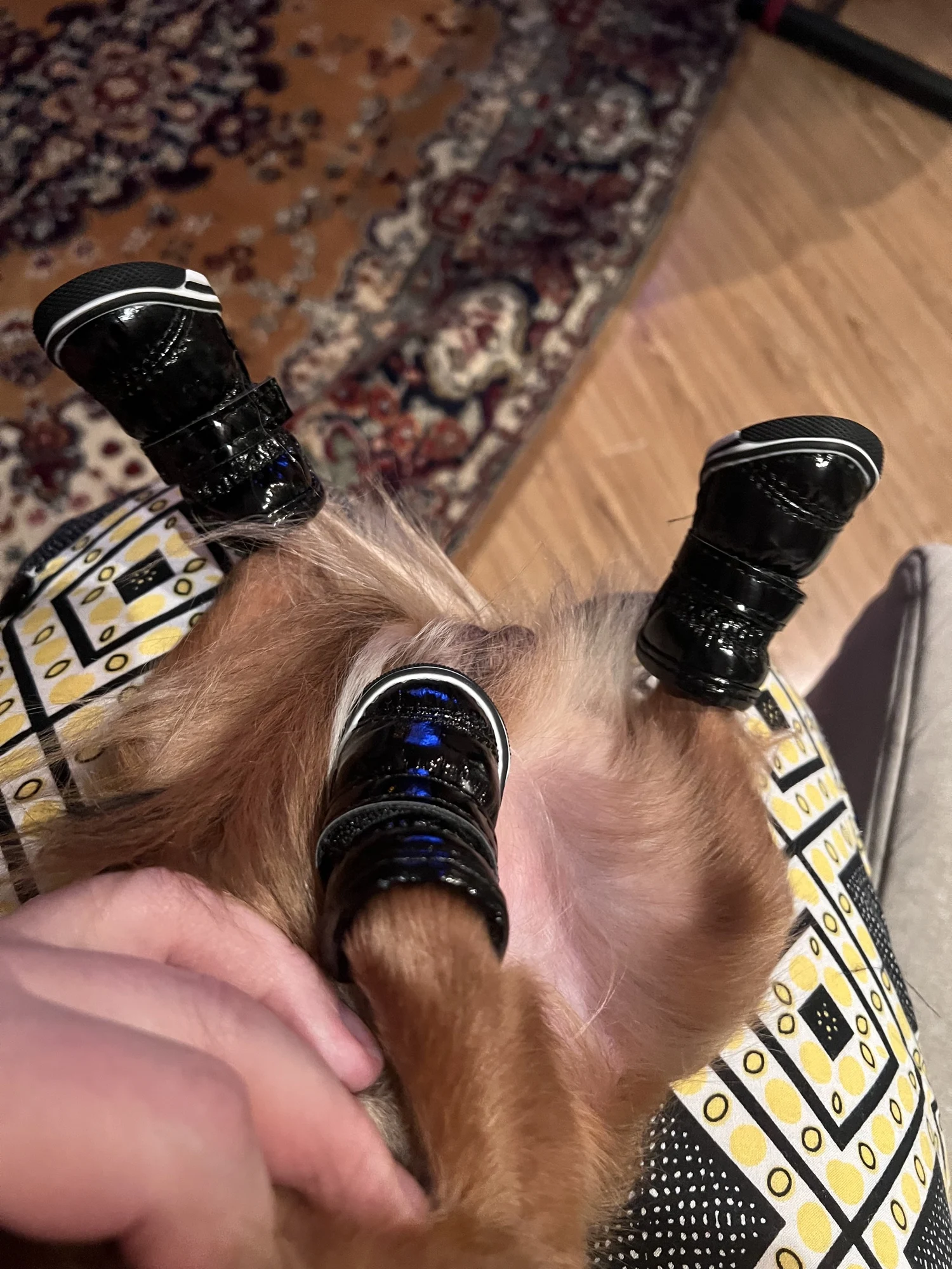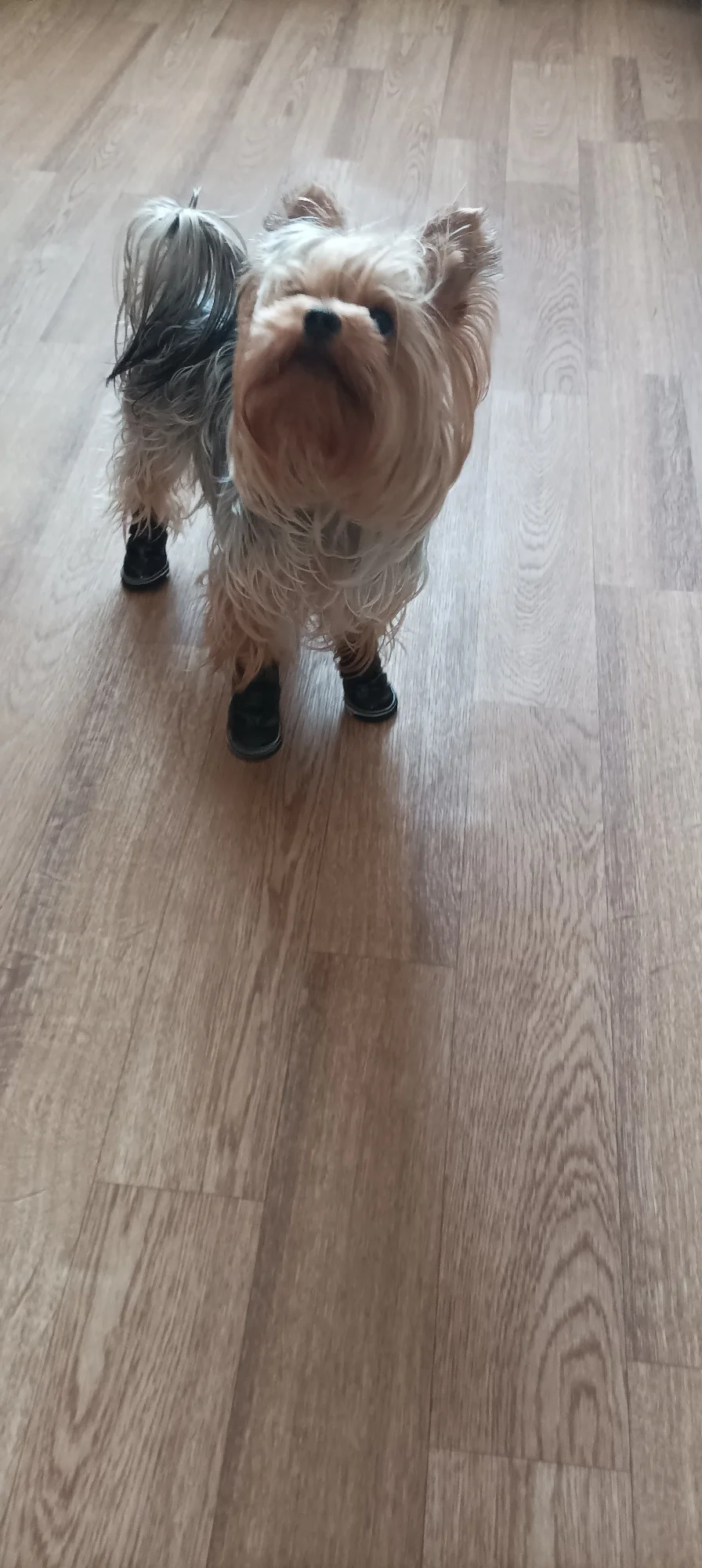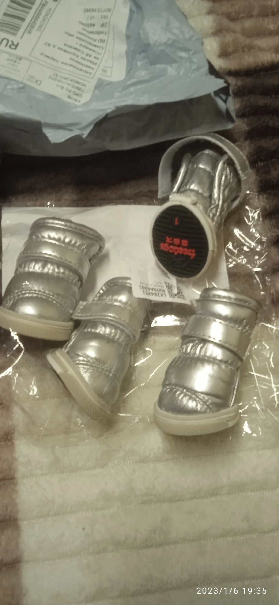 Пришли в МО за 6 дней, доставка через Pick point огонь. Брал для йорка, собака ещё не привыкла (привыкнет ли или нет, вопрос). Боты на меру, кроме подошвы, на ней тонкий слой из ткани похож на бархат. Качество в целом норм, липучка работает, за счёт их держатся на лапах надёжно.