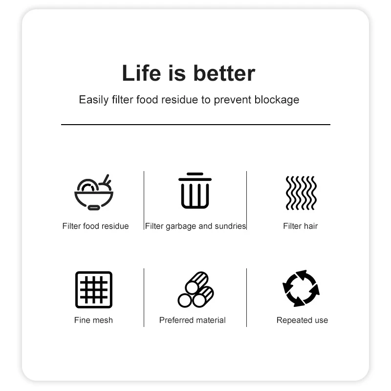 Сетчатый рот хорош, и фильтр ровный, который может легко и эффективно предотвратить попадание посторонних предметов, таких как листья овощей, волосы, остатки пищи и т. Д. В сливную трубу.