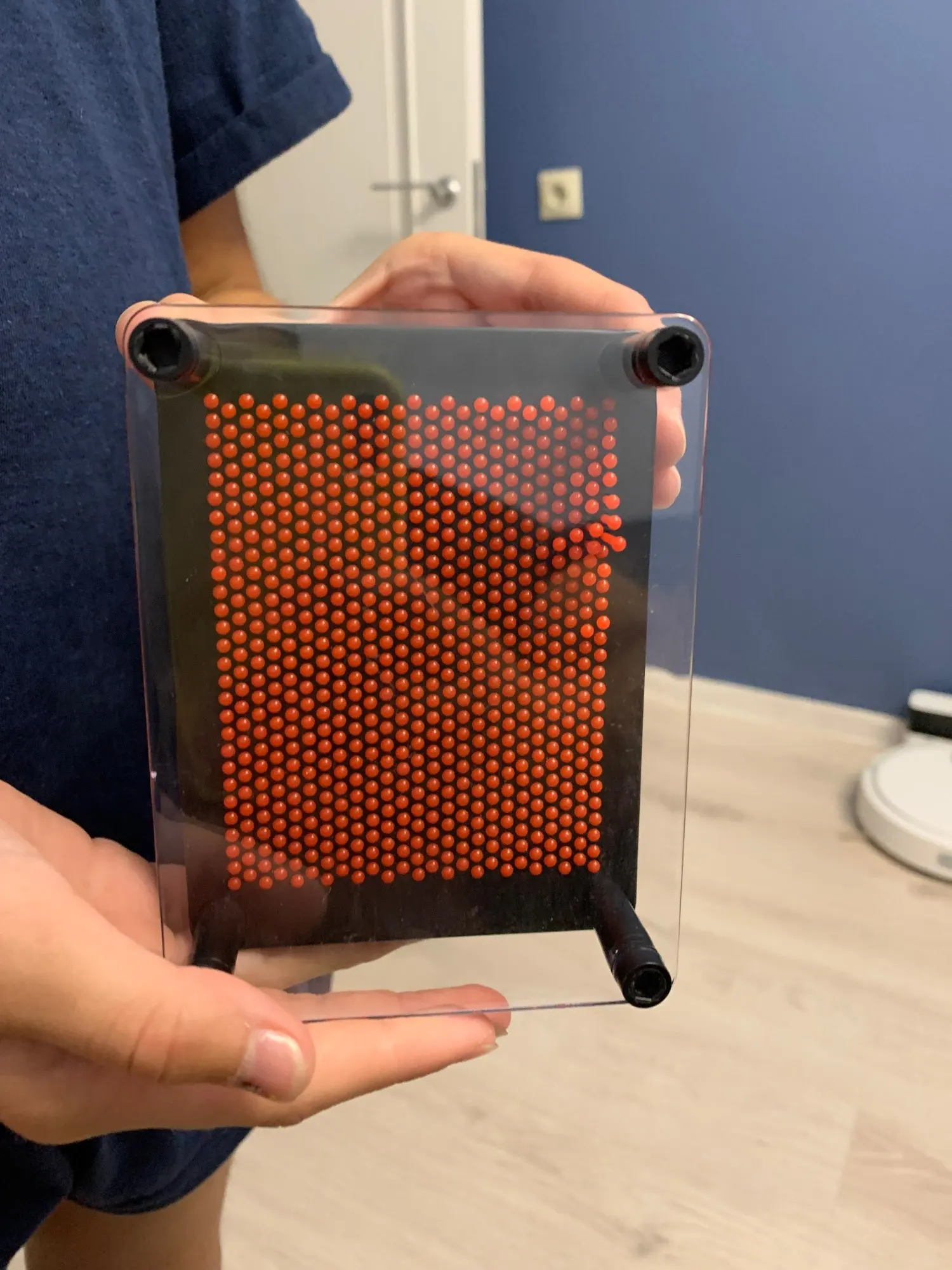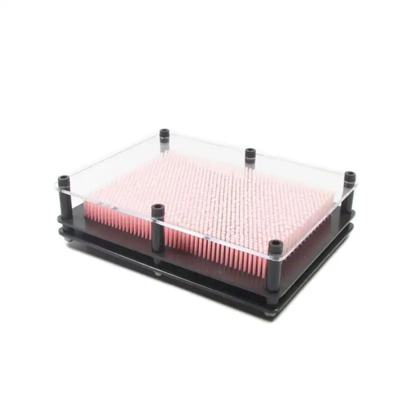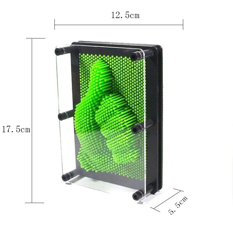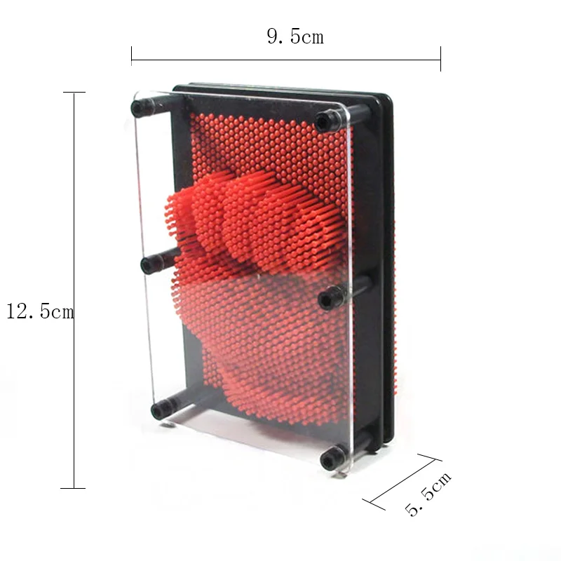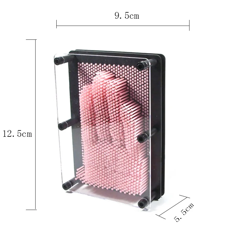 Просто нажав на предмет (или Причастие) в множество тупых штифтов, вы создадите 3d-скульптуру со всеми тонкостями контуров, точно запечатанными. Впечатление остается нетронутым до тех пор, пока устройство не нарушено. Завораживающий, художественный и веселый!