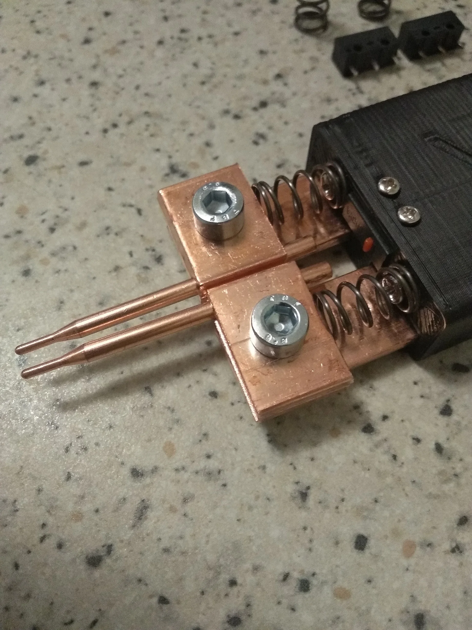 Доставка - 7 дней, Волгоград (25.07 - 01.08.2022). Упаковано все в коробку со вспененным ложементом, каждая деталь на своем месте. Комплектация: рукоятка в сборе; две запасные пружинки, два микропереключателя, шестигранник; пояснительный лист (английский/китайский языки). Все токоведущие части (шинки, электроды, пластины прижимные) выполнены из меди. Шинки имеют следующие размеры: 15х3 мм; электроды ф=3 мм, утоньшение ф=1,5 мм. В прижимных пластинах выбрана канавка под электрод. Необходимо дорабатывать, т.к. имеется люфт в корпусе держателя шинок, шинки расположены практически вплотную друг к другу. Держатель напечатан на 3D принтере, качество печати на самое качественное, видны все слои и переходы. Болты (силовые) под шестигранник M5, ограничительные - М4.
