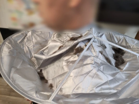 Не возможно закрыть на шее взрослого человека! Возможно, из-за маленького размера липучек для фиксации на шее! Бортик не поднимается, в связи с чем углубление для сбора волос - отсутствует! Накидка, просто прикрывает плечи, и по ней, как и прежде, - всё будет скатываться на пол!