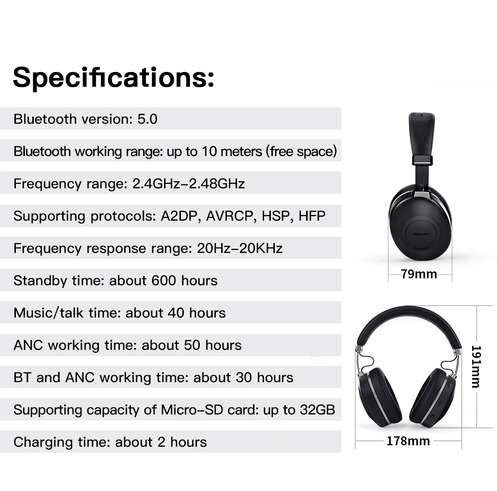 Беспроводные наушники Bluedio H2, беспроводная гарнитура ANC с поддержкой Bluetooth 5,0, со слотом для SD-карты, функцией облачного распознавания шагов и шумоподавлением через приложение