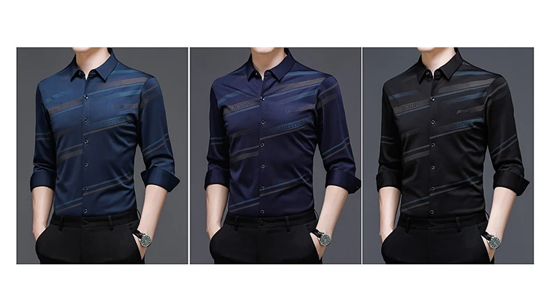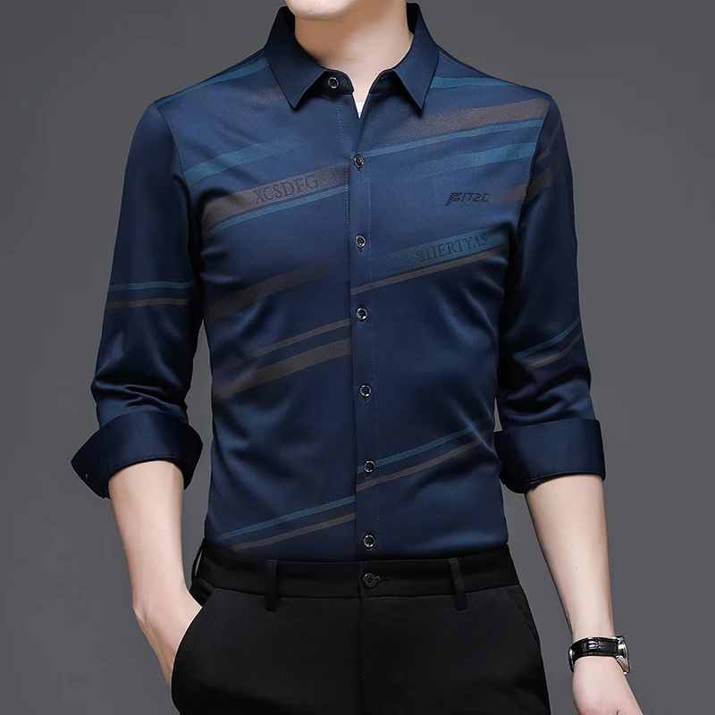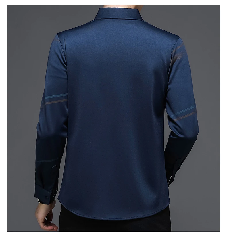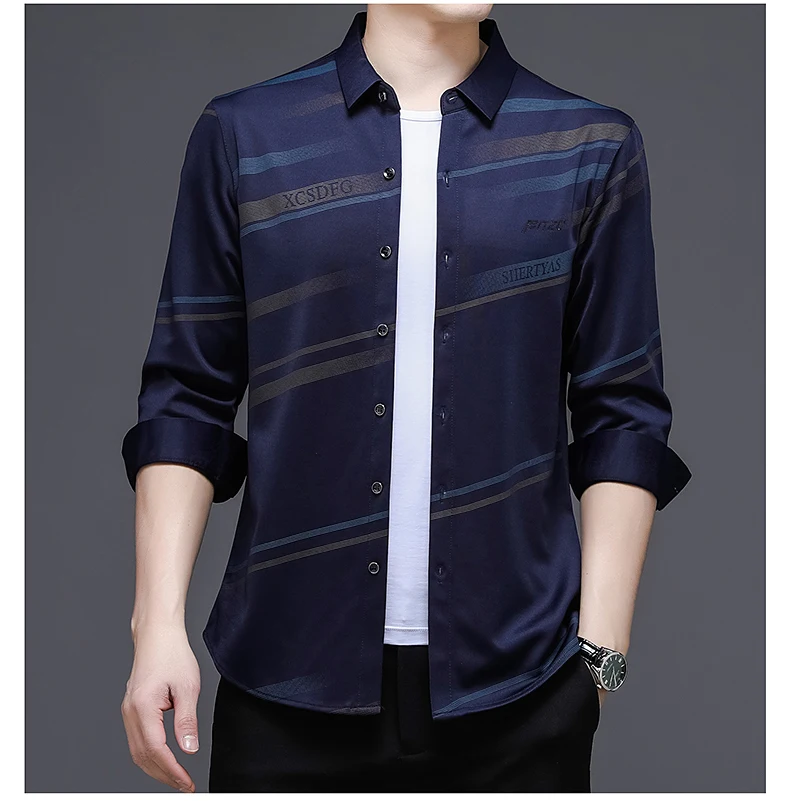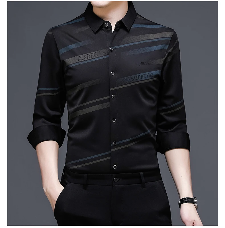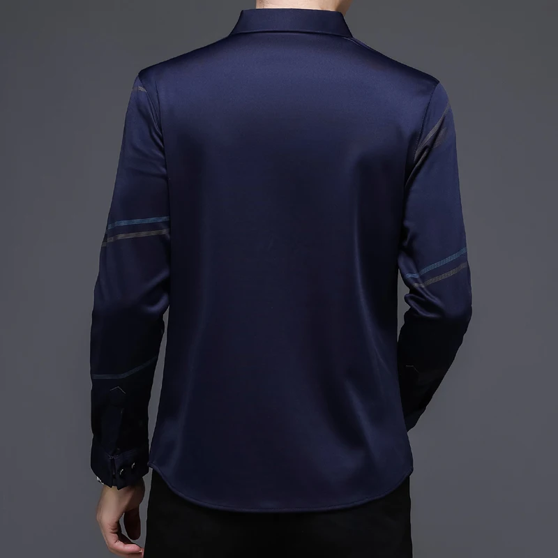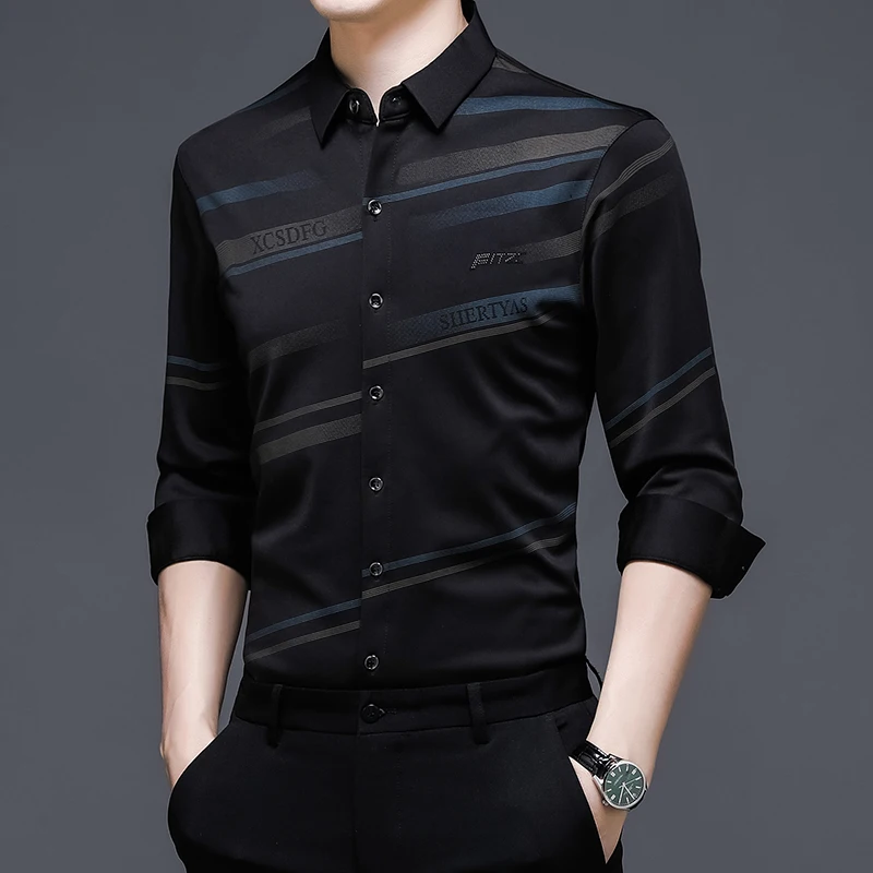 Рубашка мужская шелковая в полоску, тонкая сорочка с длинным рукаво...