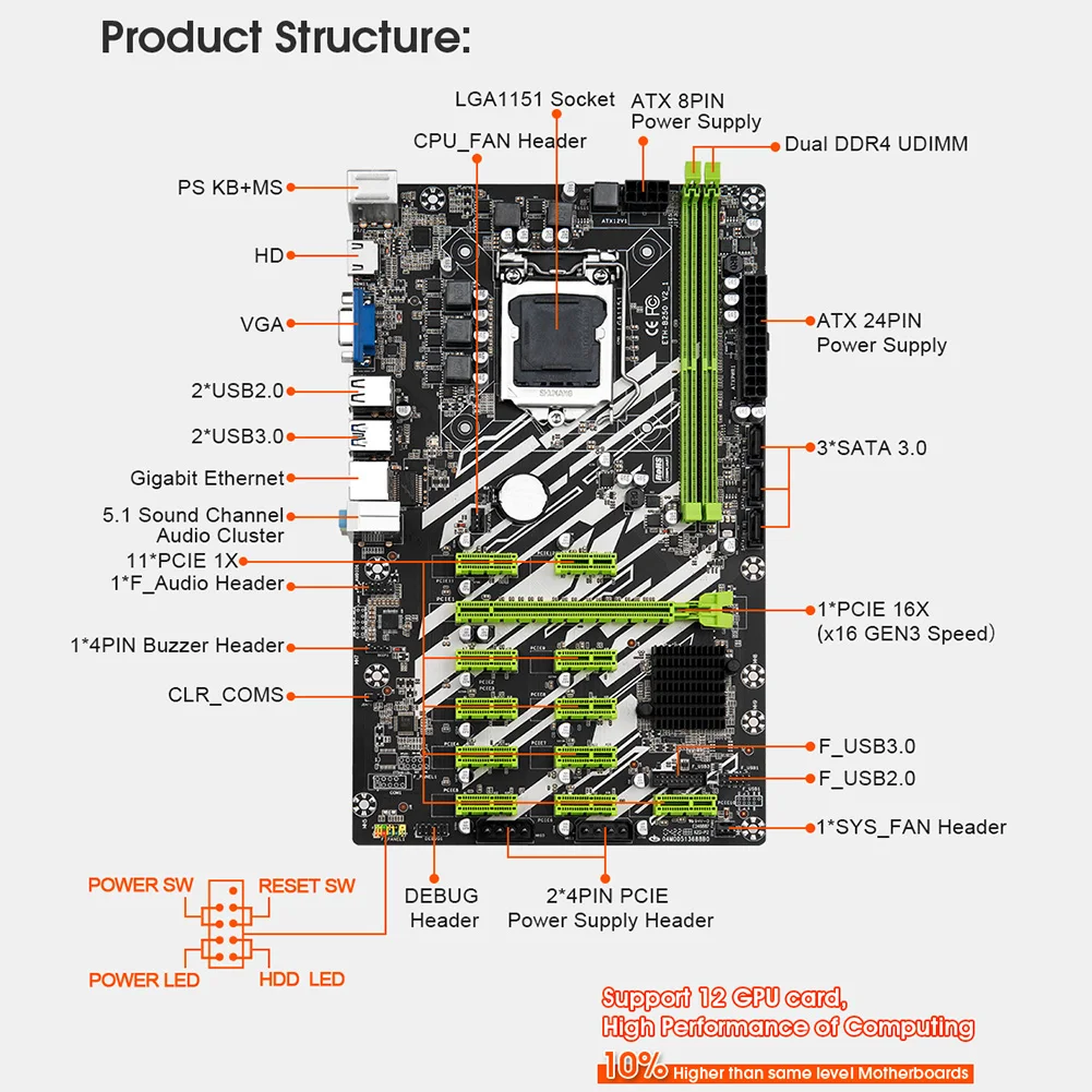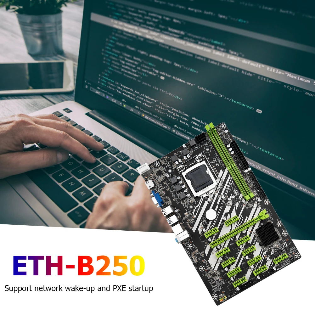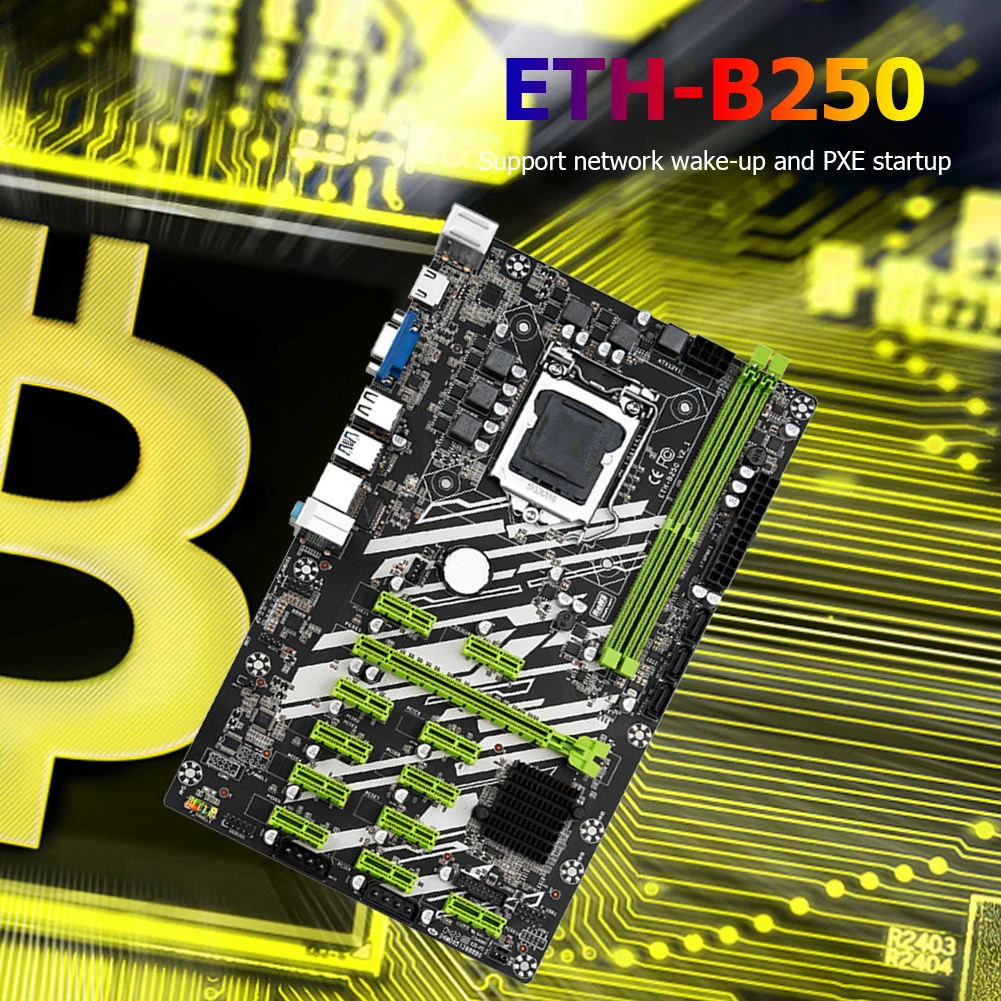 ETH-B250 BTC добыча материнская плата PCI-E16X Графика карты LGA 1151 DDR4 SATA3.0 VGA HDMI-Совместимость Поддержка 2133/2400/2666 МГц BTC Майнер низкая МощностьСпецификация:ЦП: Поддержка процессоров Intel CoreT M/ Pentium / Celeron LGA1151 серии 6/7/8 (не поддерживает процессоры 9 поколения)Набор микросхем: набор микросхем Intel B250Память: Поддержка 2 * DDR4 для рабочего стола 2133/2400/2666 МГц памяти слотов для карт (2 основных слотов для карт, двухканальный, не Поддержка память ECC)Дисплей: Встроенный ядерный дисплей, совместимый с HDMI/VGA или PCIEx16, независимая графическая карта расширенияКанал: Встроенный 1 * чип звуковой карты Realtek ALC662Сеть: 1 * Realtek RTL8111H Gigabit LAN (поддержка Wake-on-LAN и PXE boot)Хранение: 3 * SATA3.0USB: 4 * USB3.0 + 4 * USB2.0Superlol: ITE IT8772EРасширяемый слот: поддержка 1 * PCIE 16X слот (скорость x16GEN3) + 11 * PCIE 1X слот (скорость x1GEN1.1)Блок питания: ATX 24PIN + ATX 8PINРазмер: 281.36x170ммПримечание:В связи с различиями мониторов и эффектами освещения реальный цвет товара может немного отличаться от цвета на фотографиях. Спасибо!Возможны отклонения в 1-2 см вследствие измерений вручную.