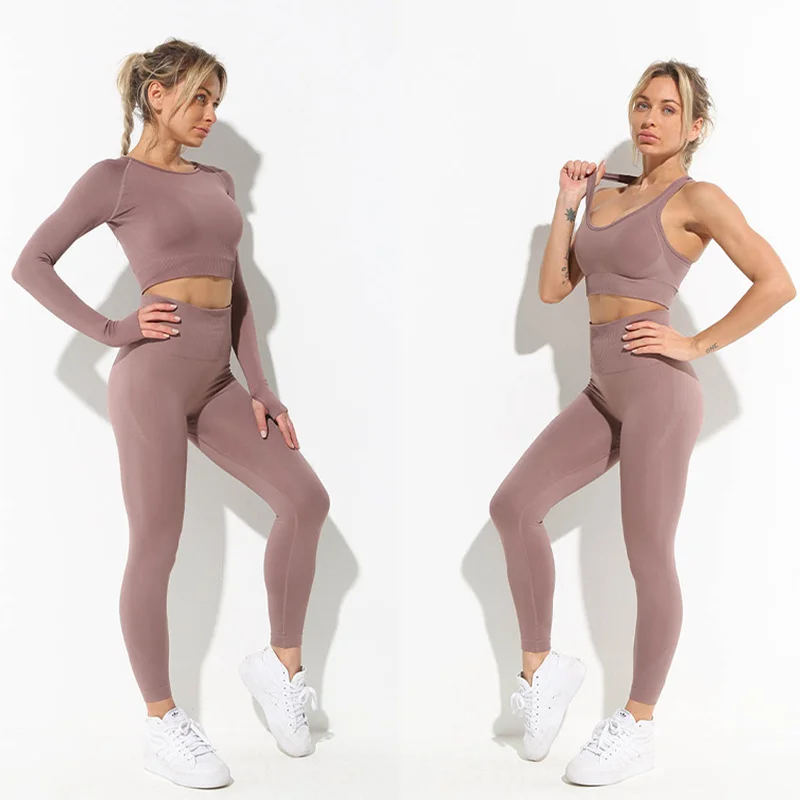 Бесшовный Женский комплект для йоги, тренировочная спортивная одежда, одежда для тренажерного зала, рубашка с длинным рукавом, бюстгальтер, укороченный топ, леггинсы с высокой талией, спортивный костюм
