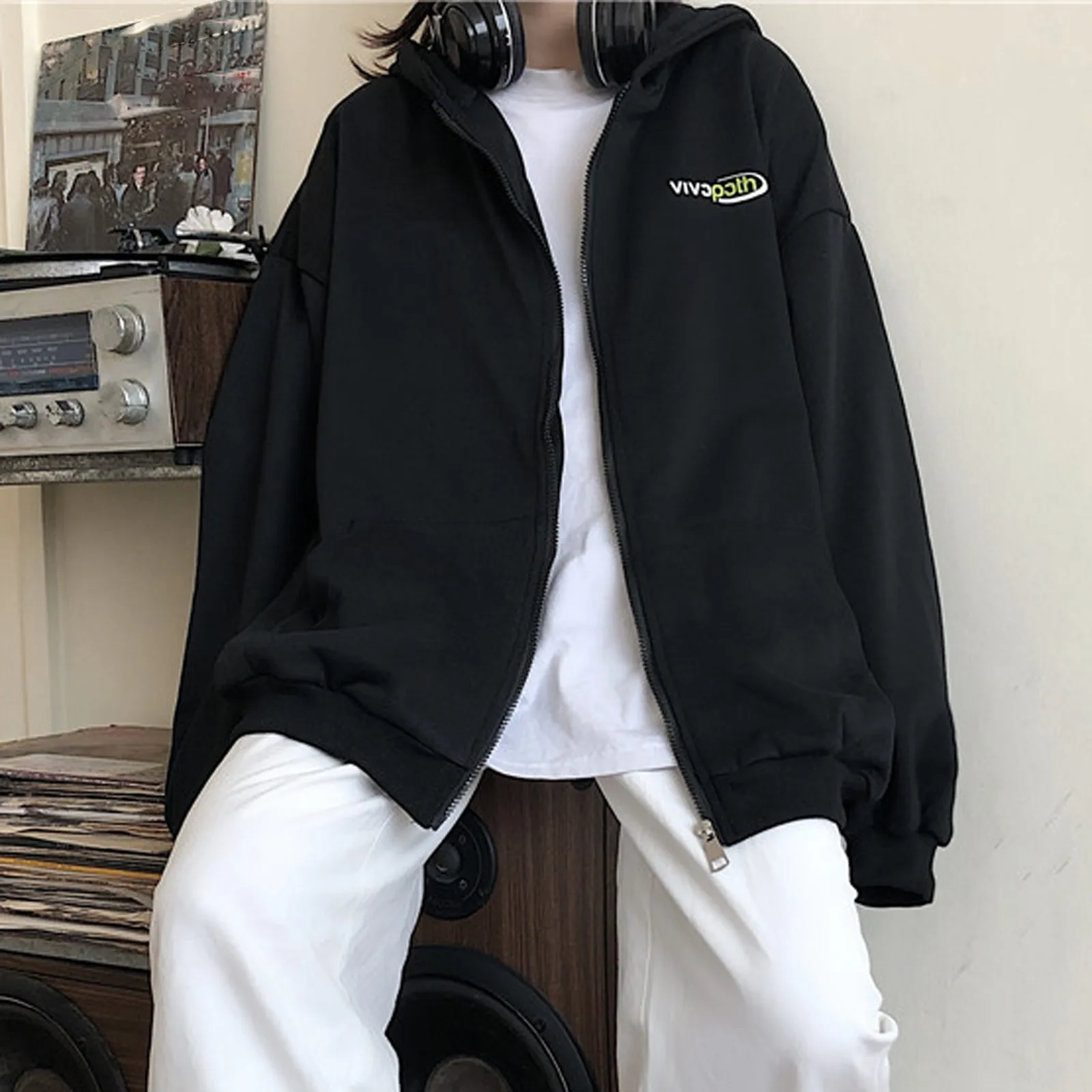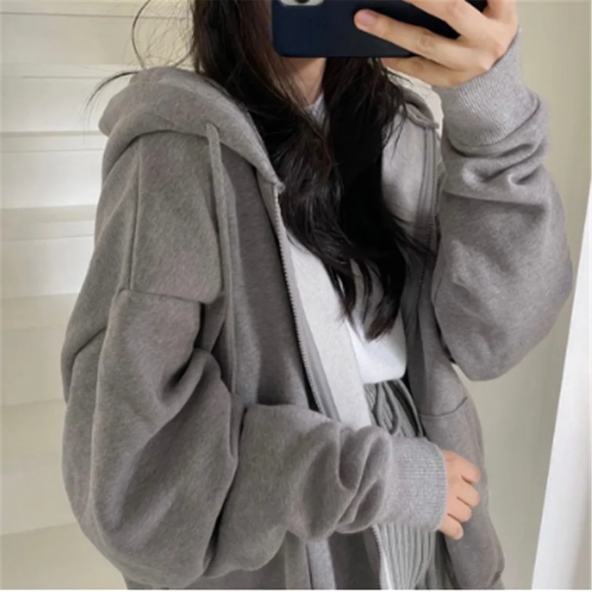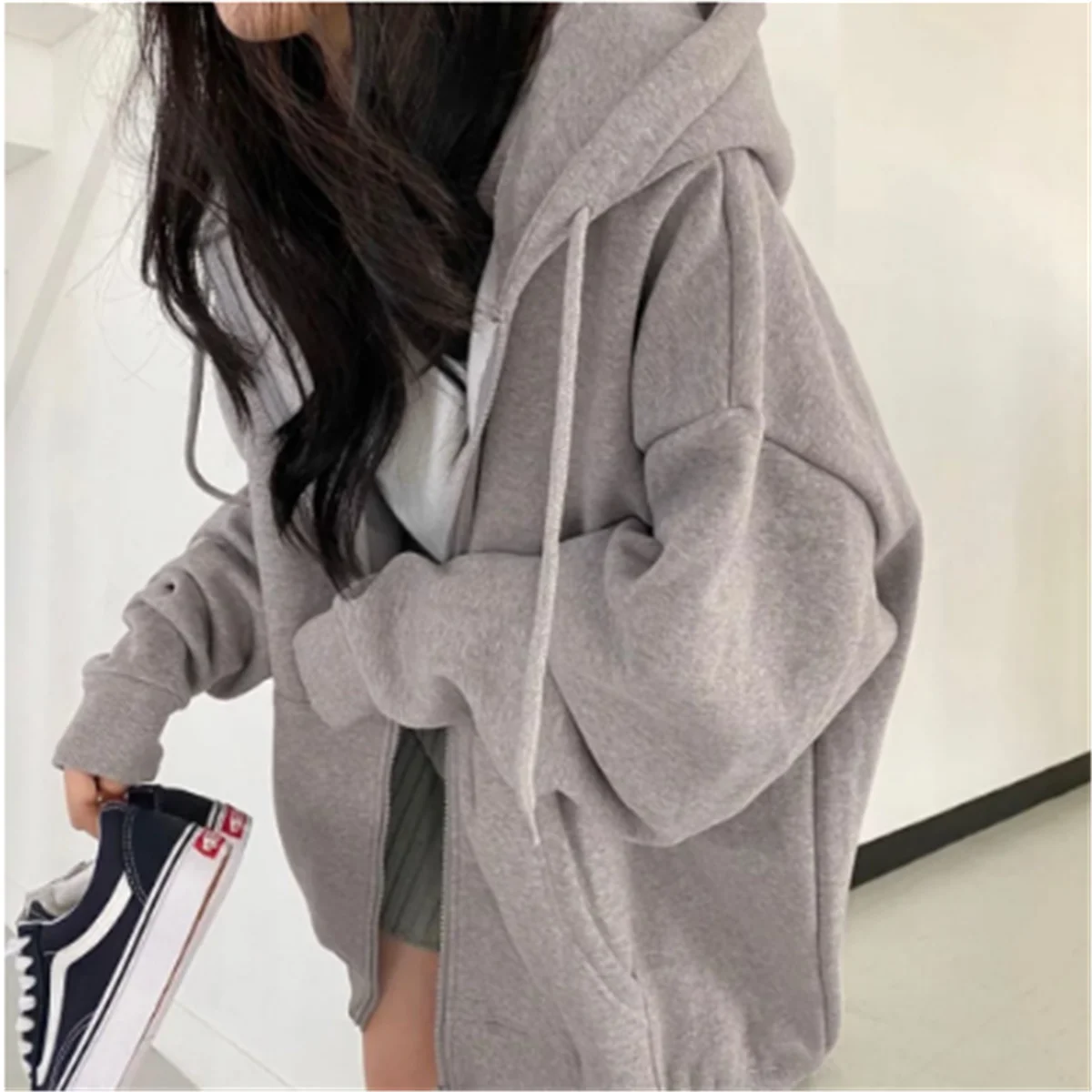 Женские толстовки большого размера, Осенние повседневные однотонные свитшоты на молнии, Корейская версия, свободное тонкое пальто с длинным рукавом