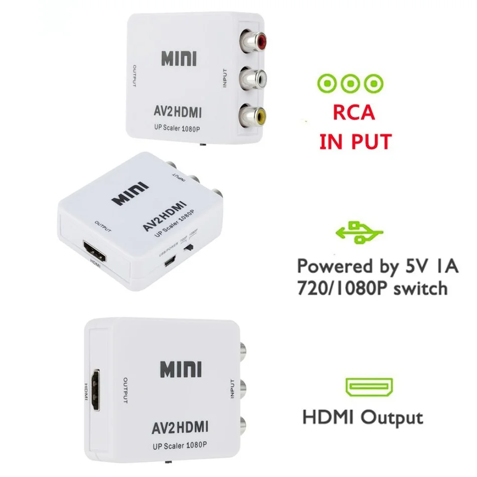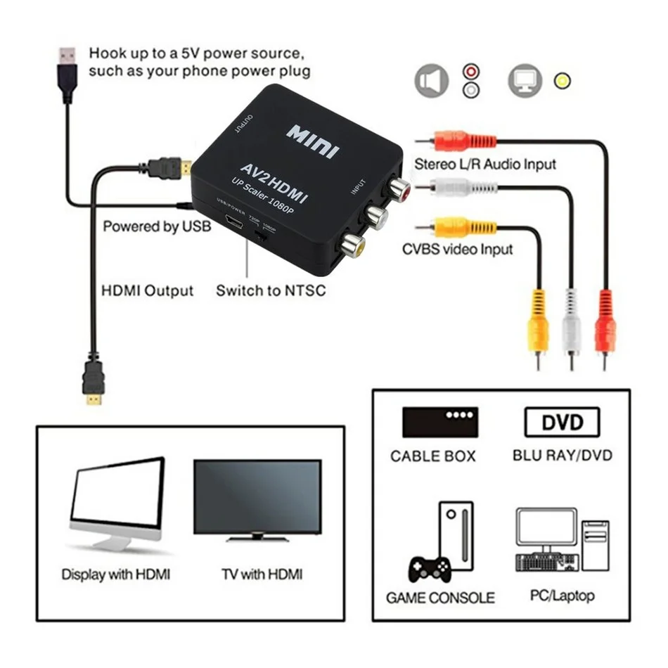 Просто Подключите стандартные композитные AV кабели (желтый, красный и белый) к входному порту конвертера, а затем подключите HDMI-совместимый кабель от конвертера к телевизору