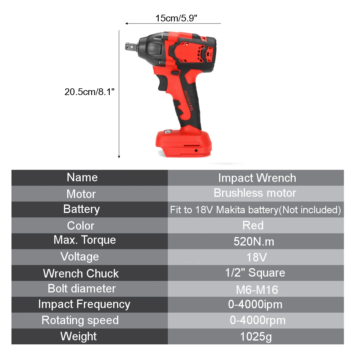 18V 520N.m. Беспроводной ударный бесщеточный гайковерт 12 дюйма, электрический гайковерт, электроинструменты, замена для батареи Makita
