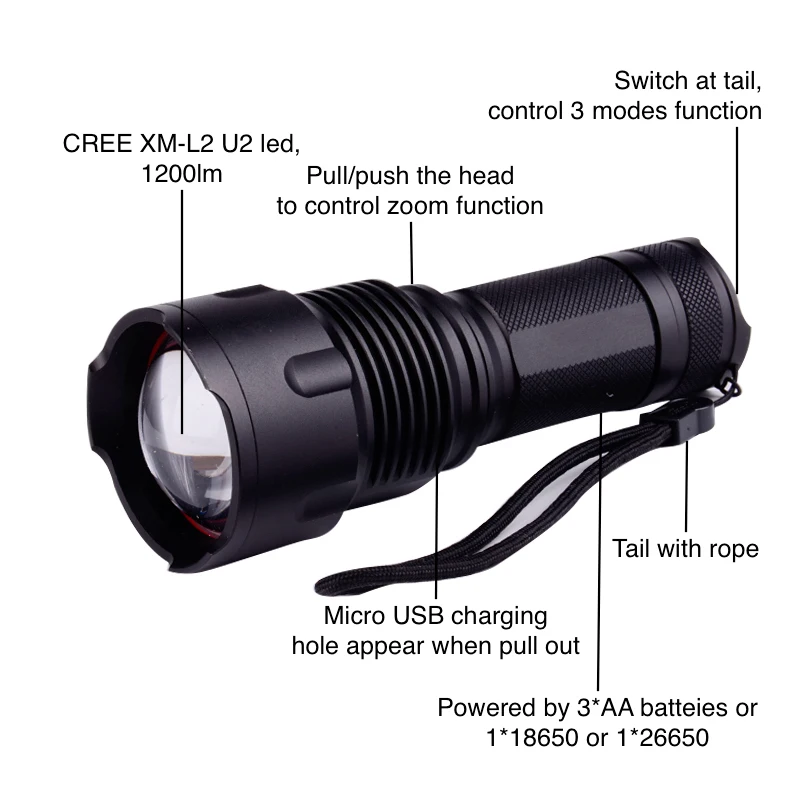 • Источник питания: 1x26650 3,7 v литий-ионный аккумулятор или 3X AA батарея (аккумулятор не прилагаются) * Время работы: 2-4 часа * Яркость: 200-2000 люменов * Расстояние луча: 250-500 м
