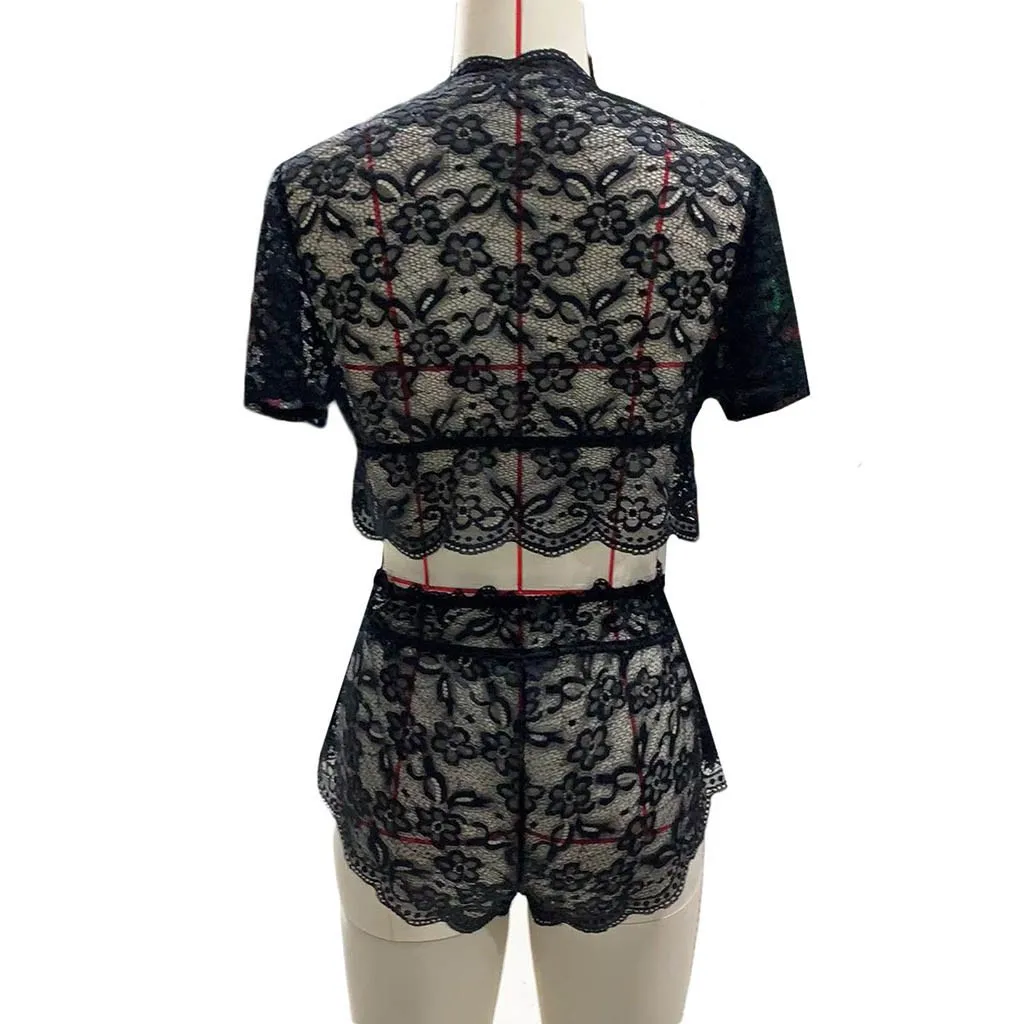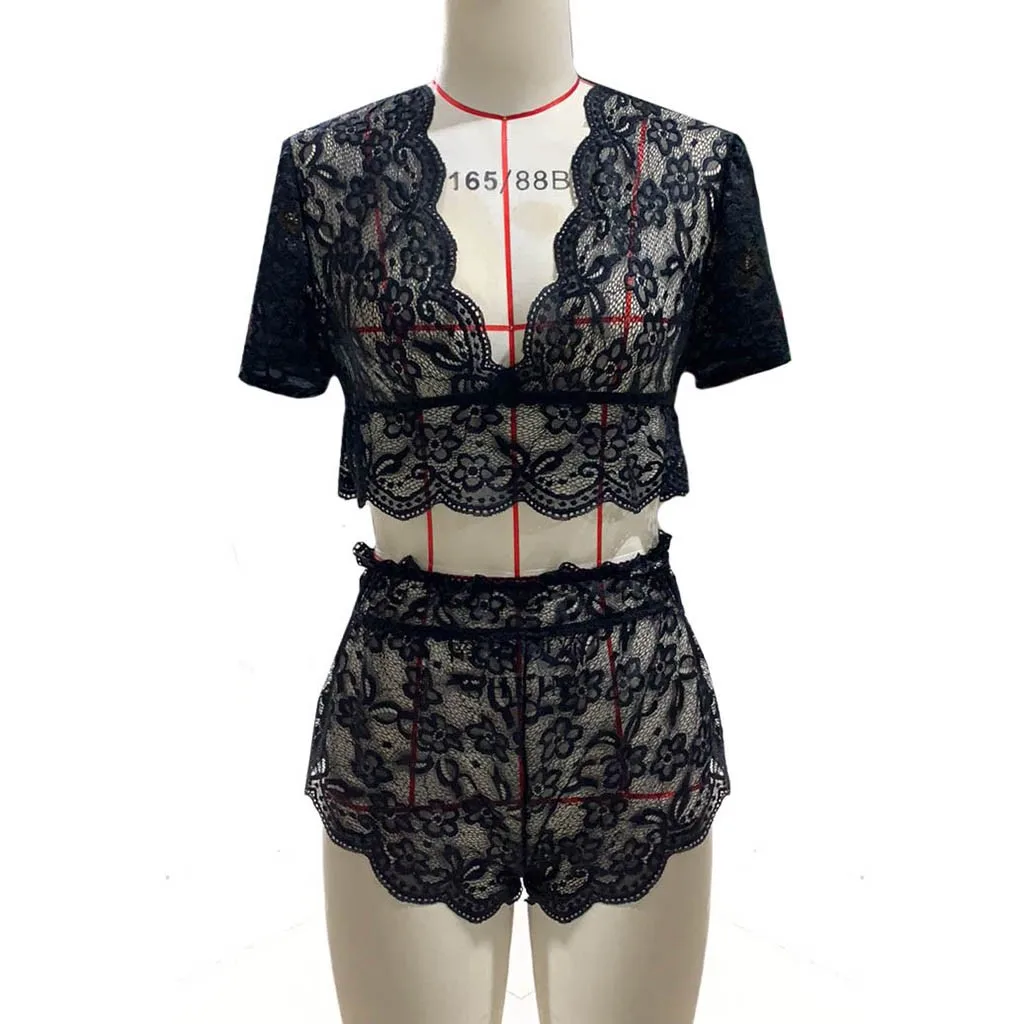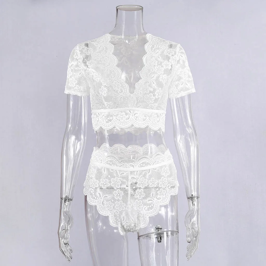 Женское сексуальное кружевное нижнее белье, бюстгальтер, короткий комплект с V-образным вырезом, Короткие топы, стринги, топ с коротким рукавом, нижнее белье, трусики, ночное белье
