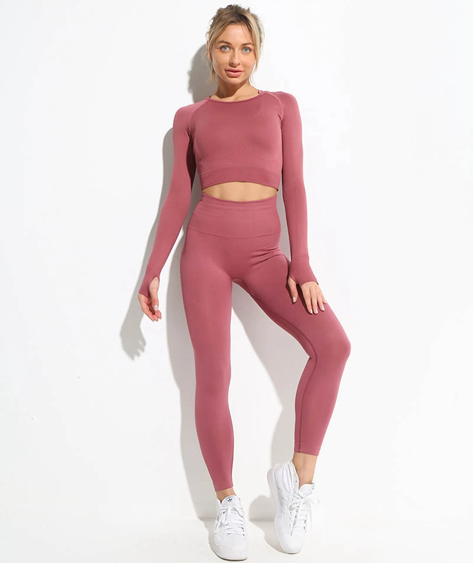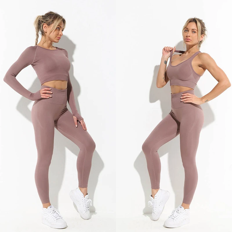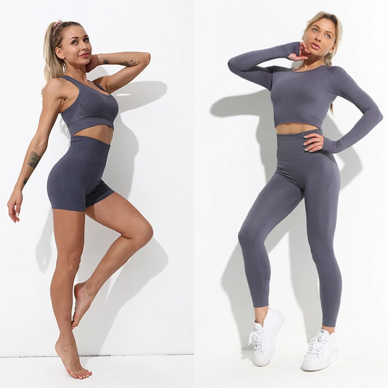 Женский спортивный костюм, комплект для йоги, спортивная одежда, одежда для тренировок в тренажерном зале, укороченный топ с длинным рукавом, леггинсы с высокой талией, спортивный бюстгальтер, спортивный костюм