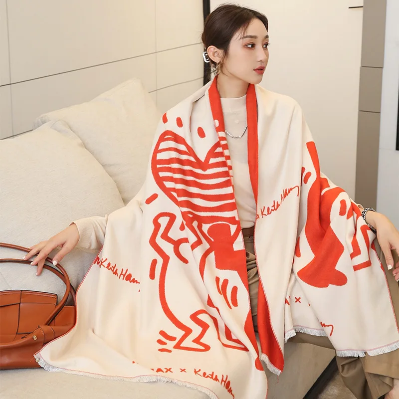 Зимний кашемировый шарф 2021, женские шали из пашмины с мультяшным принтом, женские пледы, плотное теплое одеяло Bufanda