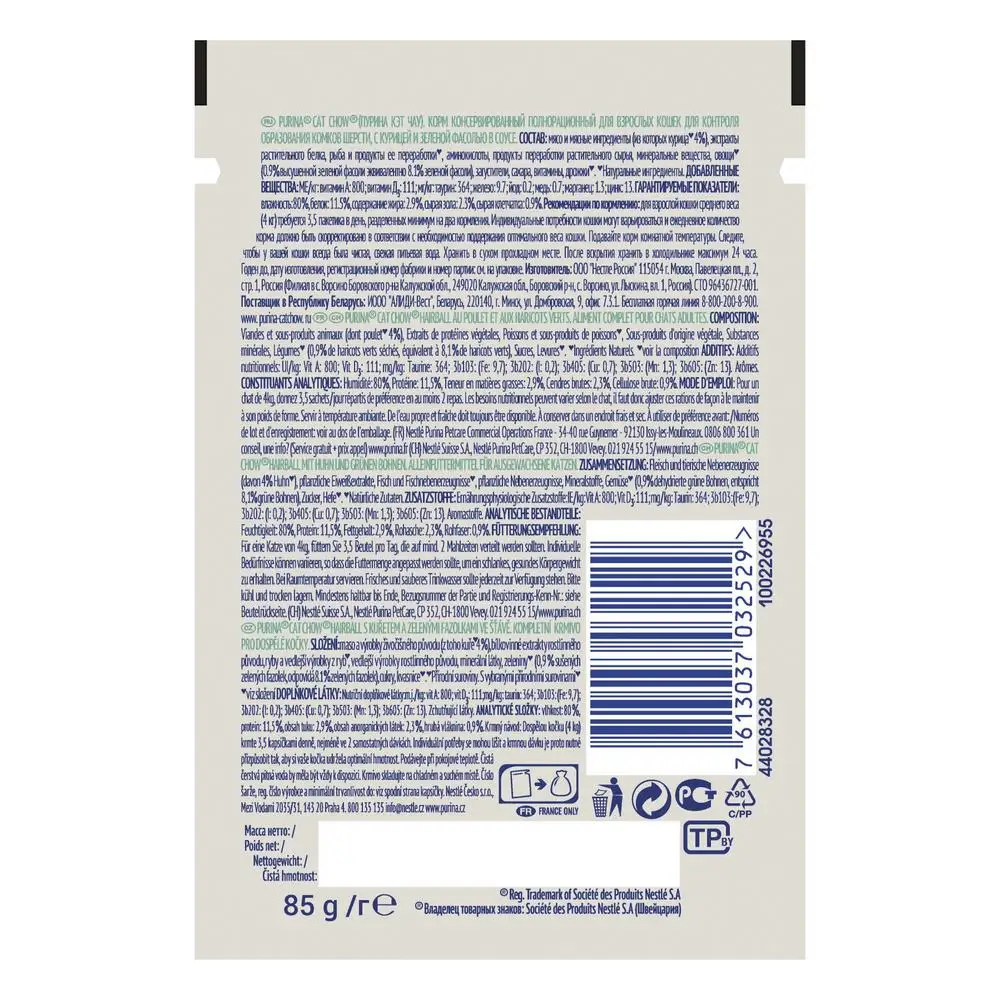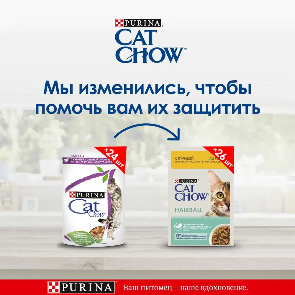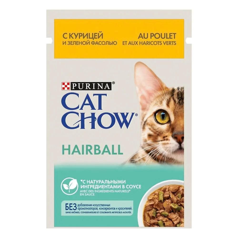 Влажный корм Cat Chow для взрослых кошек, контроль образования комков шерсти, курица и зеленая фасоль в соусе, Пауч, 85 г*26 шт