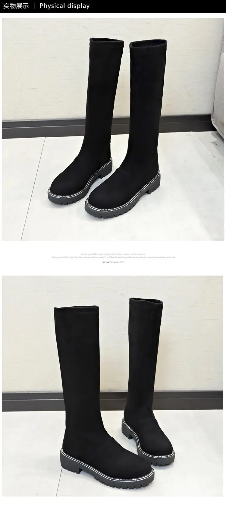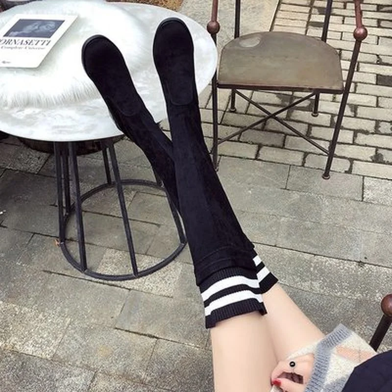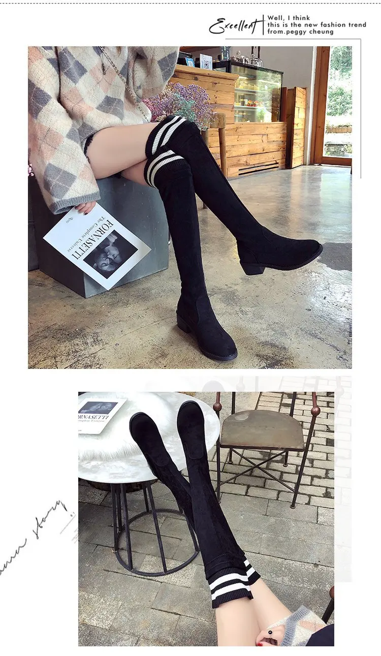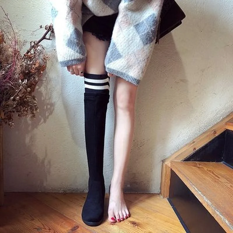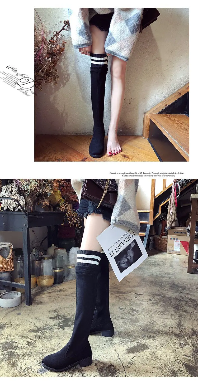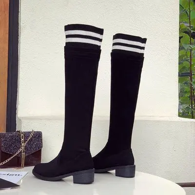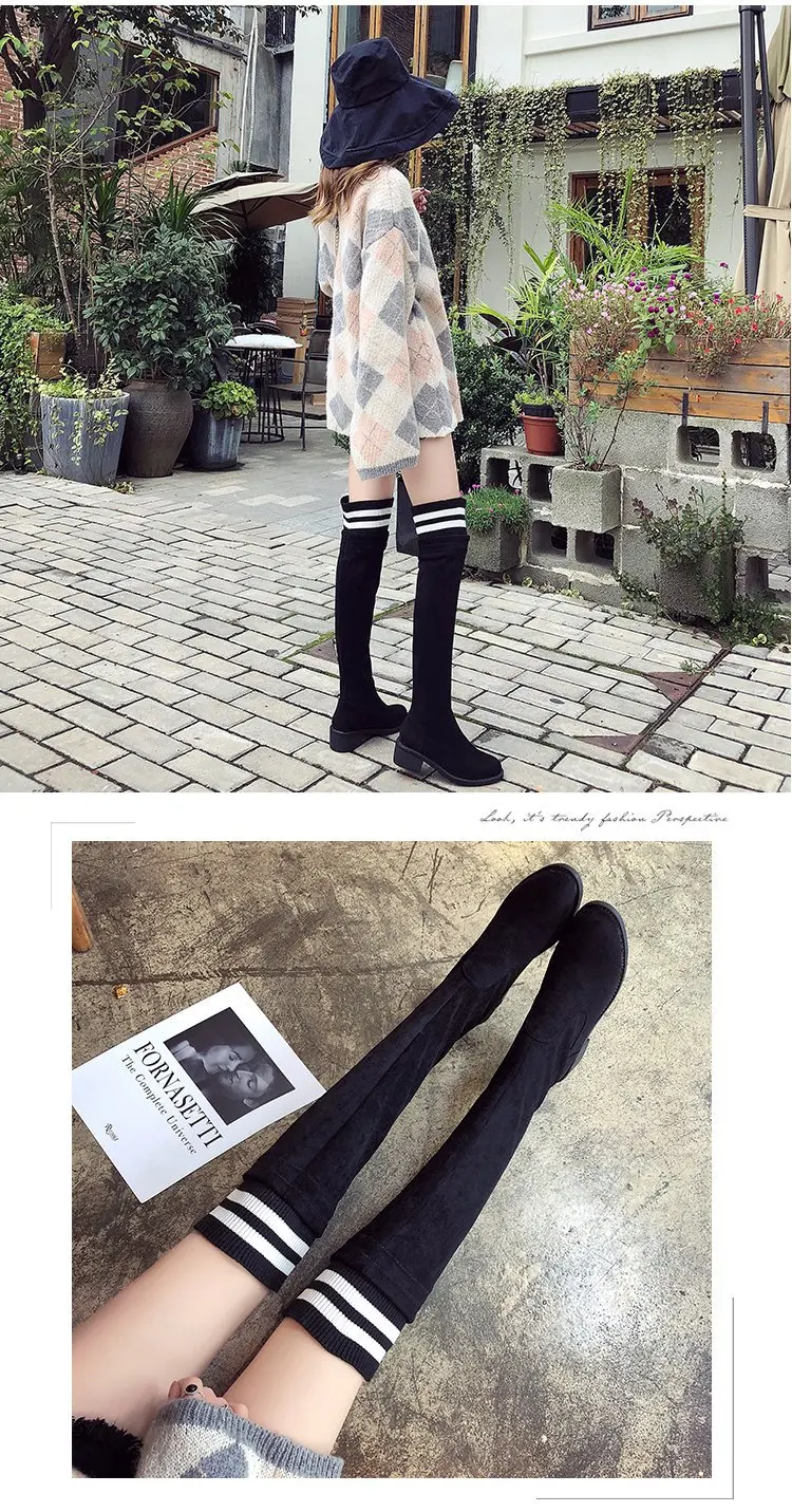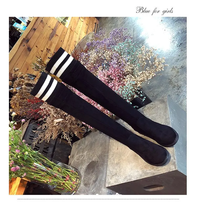 Облегающие сапоги на плоской подошве, плюшевые модные вязаные сапоги выше колена, женские зимние плюшевые сапоги в полоску