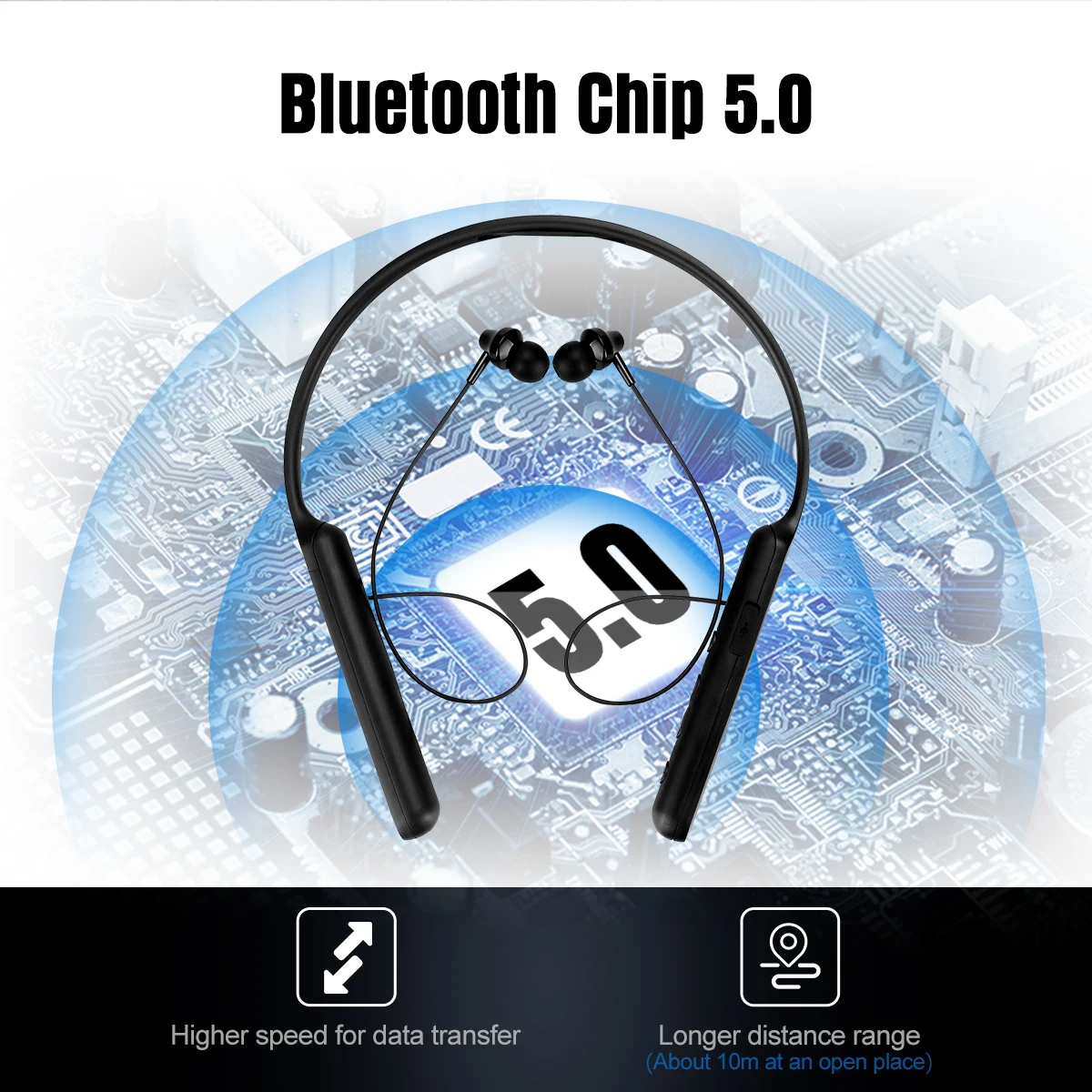2. Чип Bluetooth 5,0:Основные преимущества встроенного Bluetooth 5,0-Улучшенная скорость и большой радиус действия. Он быстрее и может работать на больших расстояниях, чем старые версии Bluetooth. Подключенные устройства находятся на расстоянии около 10 метров в открытых местах.