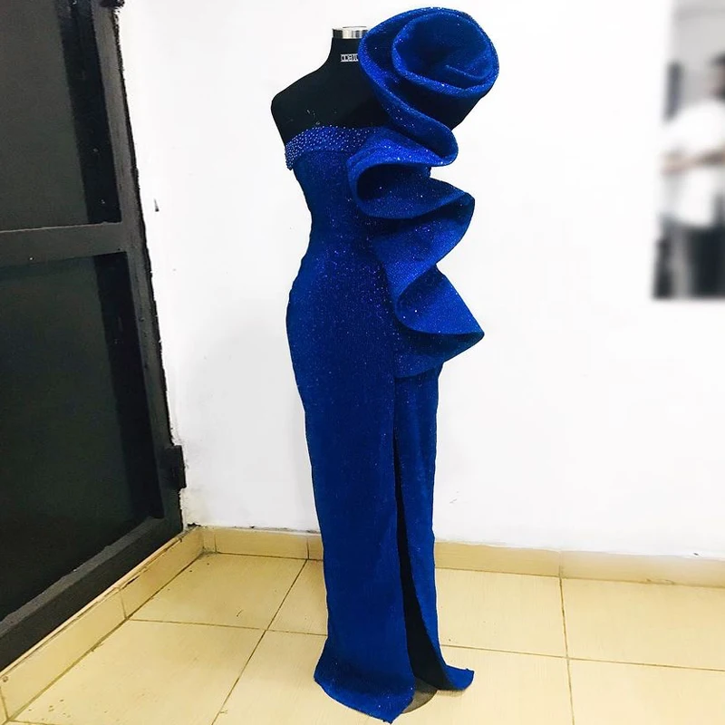 Женское вечернее платье с юбкой годе, синее платье на одно плечо с разрезом по бокам, расшитое блестками, с оборками и жемчугом, для выпускного вечера