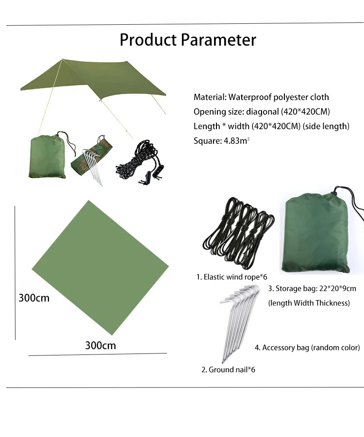300x300 см: 1 брезент + 6 брезентовых гвоздей + 6 брезентовых канатов + 1 Сумочка