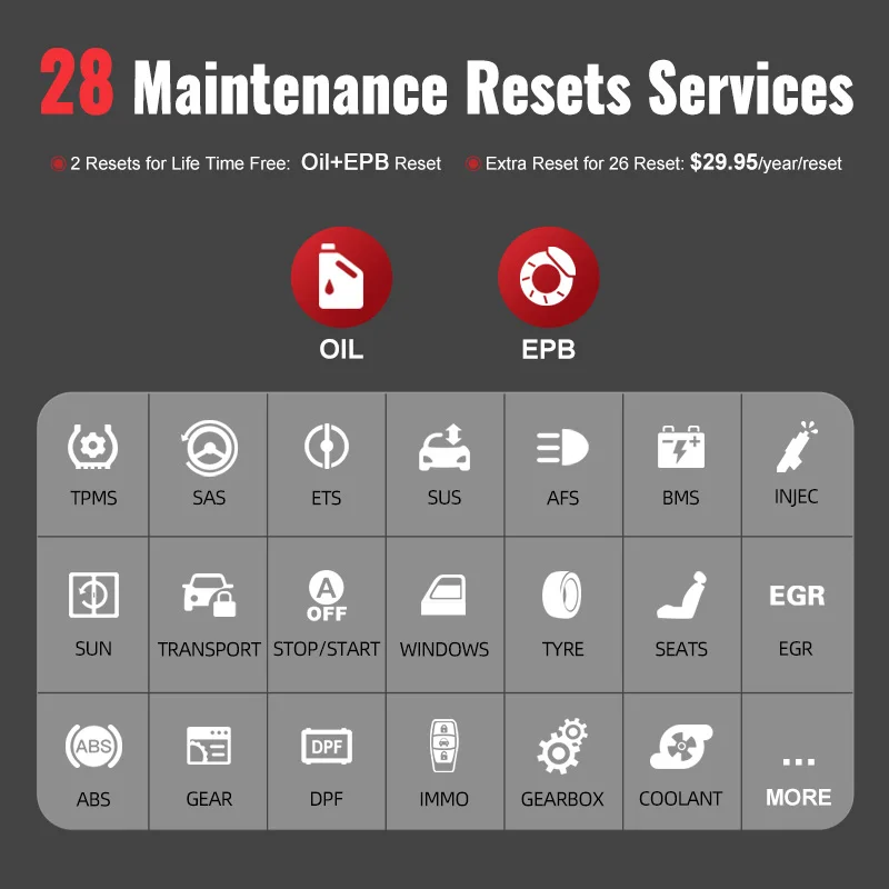 MUCAR CS2 в настоящее время поддерживает программное обеспечение для обслуживания 28, программное обеспечение для технического обслуживания является полностью бесплатным и бесплатным для обновления. Масло/EPB восстанавливает срок службы бесплатно всех автомобилей.1. Обслуживание сброса масляной лампыПозволяет выполнить сброс для нового расчета системы жизнедеятельности моторного масла после изменения масла.2. Сброс электронного стояночного тормоза EPBЭто важно для поддержания безопасности и эффективности электронной тормозной системы.3. Батарея летучей мышиПозволяет сканировать устройство, чтобы оценить состояние заряда батареи, контролировать ток замыкания, зарегистрировать замену батареи и активировать остальное состояние транспортного средства.4. Сброс дизельных Сажевых фильтров DPFСпециально работает для дизельных Сажевых фильтрующих систем с регенерацией DPF, замена компонентов DPF после замены блока управления двигателем.5. Сброс датчика рулевого управления SASПомогает очистить воспоминания датчика угла поворота руля и играет важную роль в калибровке датчика угла руля.6. Сброс системы контроля давления в шинах TPMSИмеет смысл в отображении сенсорных идентификаторов из Эбу транспортного средства, вставке TPMS сенсорных сменных идентификаторов и датчиков тестирования.7. Программирование ключа IMMOУникальная функция программирования автомобильных ключей и считывания ПИН-кода, она в основном используется для отключения ключей от утерянного транспортного средства и программирования нового сменного ключа fob.8. Кровотечение из АБС-пластикаABS тормозное кровотечение, чтобы получить твердую тормозную колодку После истощения воздуха после ремонта ABS насосной системы.9. Сброс крыш солнцаSunroof должен быть сброшен, когда блок управления sunroof имеет коммуникационную проблему или изменен.10. Сброс подвескиПопробуйте сбросить электронное пневматическое колесо Подвески с системой массажа закройте все двери koeo flip через систему сообщений перейти к сбросу подвески или выключению.11. Сброс коробки передач (коробки передач)Процедура сброса передачи Адаптивное обучение DIY. Запуск автомобиля и вождение. Как только вы выполните эту процедуру, блок управления двигателем (ECU) и блок управления передачей (TCU) будут работать вместе, чтобы узнать, как Вы управляете, отслеживая ваш шаблон вождения. После того, как вы выполните этот метод программирования TCU / ECU, Управляйте автомобилем.12.AFS сброс фары«AFS» означает адаптивную систему переднего освещения (в ночное время с би-ксеноновыми фарами), она поворачивается с обеих сторон, Нажатие этой кнопки означает, что они остаются направленными вперед и не поворачиваются, когда вы поворачиваете руль.13. Кодирование инжектораУтечки инжекторов и некоторые мертвые инжекторы могут быть пропущены даже когда инжектор отключен. Другие проблемы с системой зажигания и механическими компонентами также могут не показывать потерю оборотов в минуту при выключении инжектора.14. Адаптация дроссельной заслонкиКорпус дроссельной заслонки представляет собой трубу с поворотным плоским клапаном (бабочкой), которая используется для контроля количества воздуха, входящего в двигатель. В автомобиле с электронным топливом Датчик положения дроссельной заслонки и датчик воздушного потока связываются с компьютером, ко