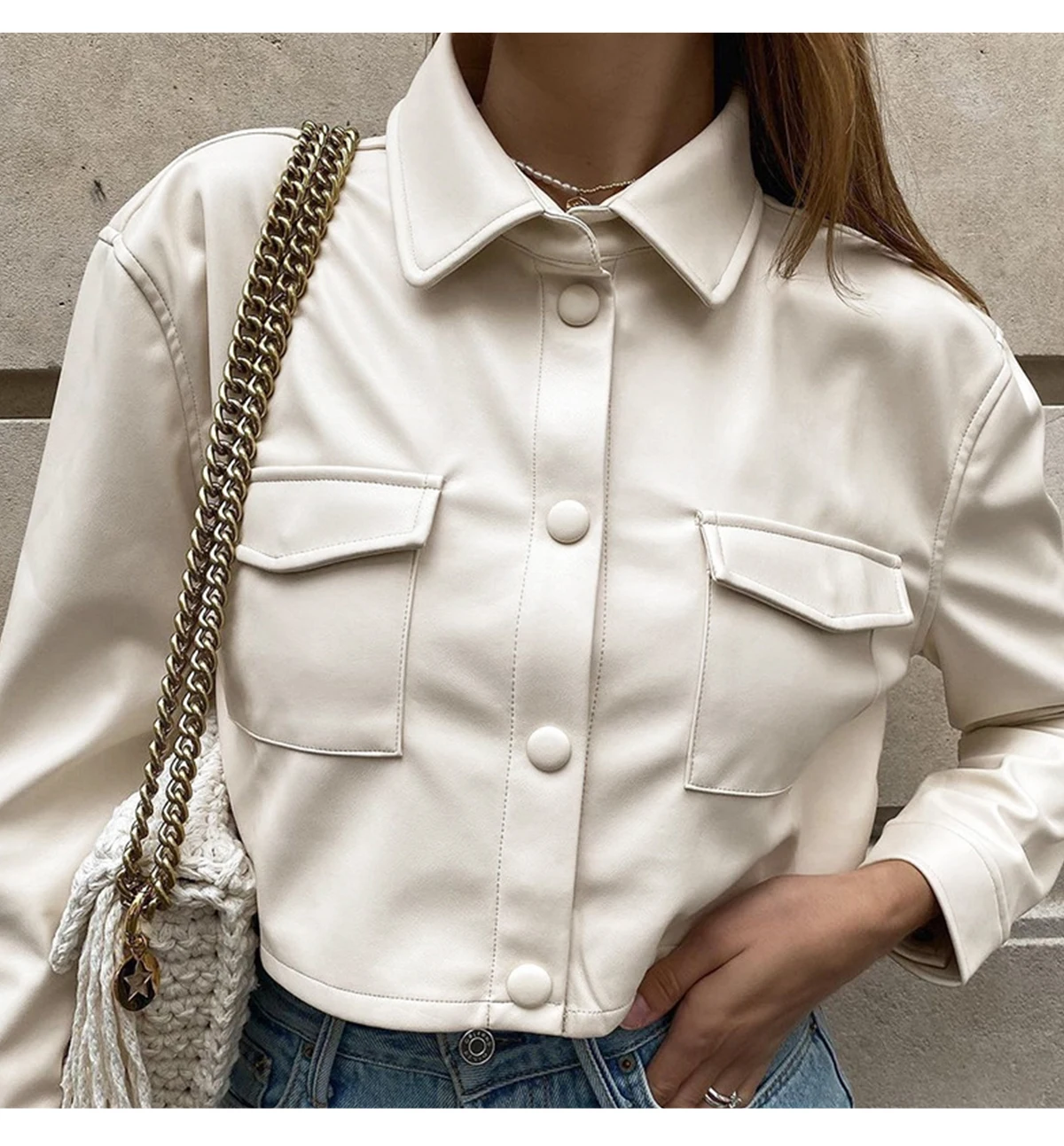 Рубашка женская из экокожи, с отложным воротником и двумя карманами