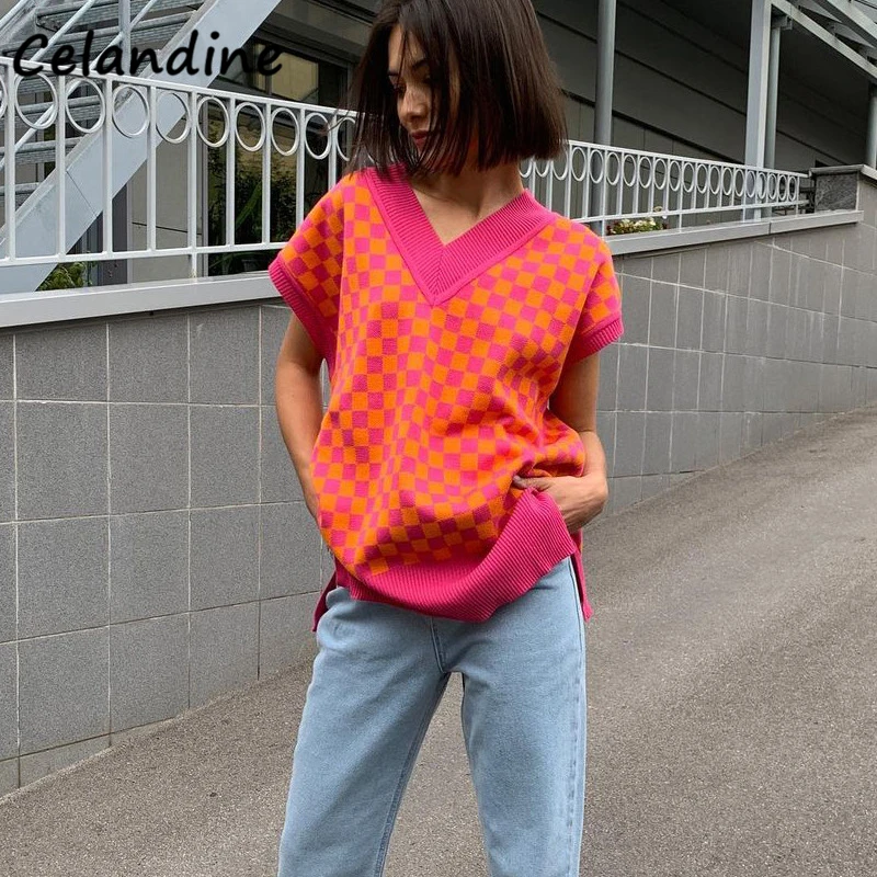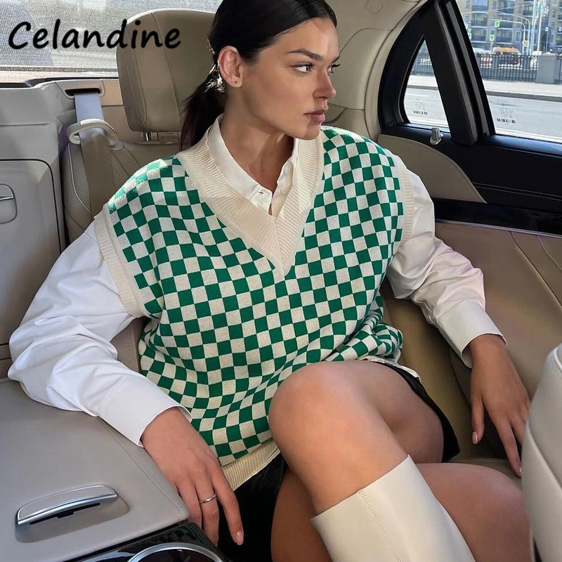 Пуловеры Celandine, вязаный клетчатый жилет без рукавов Y2K, повседневные Джемперы, зеленый зимний модный свитер с V-образным вырезом, женские укороченные топы 2021