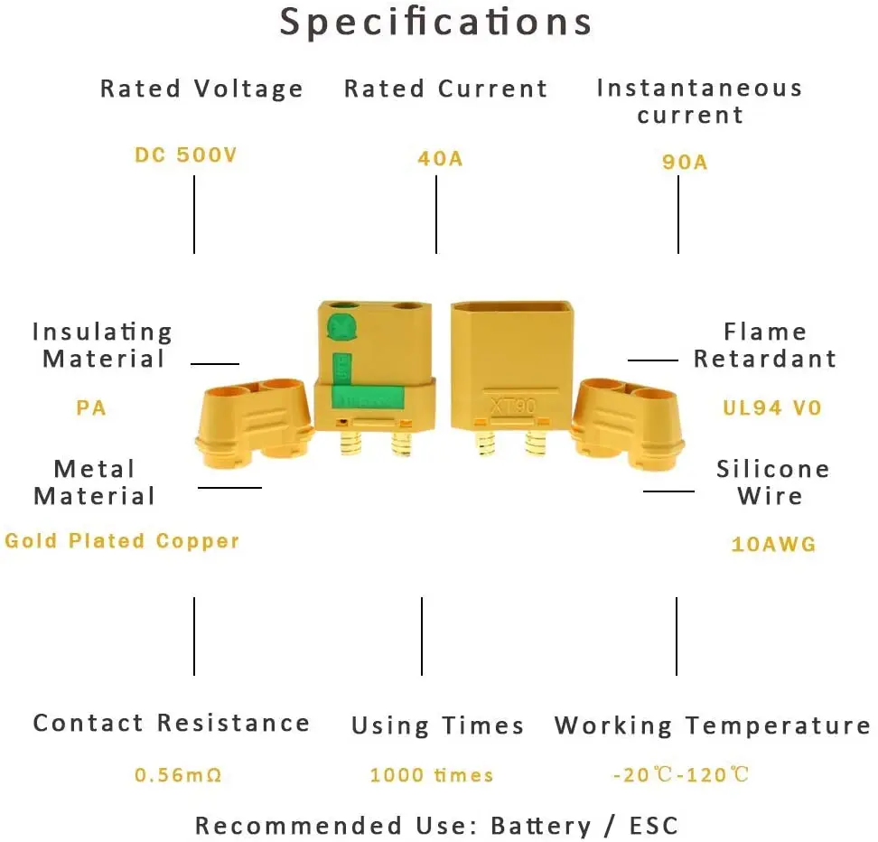 Уникальный XT90-S-это конструкция зажигания от штепсельной вилки, фюзеляж в маленькой штепсельной вилке в сопротивление, для достижения большого объема AS150, ранее необходимого для достижения функции зажигания от штепсельной вилки. Совместимость с обычными XT90.XT90-S вилкой, штепсельная вилка XT90 на основе успеха продажи по введению обновленной версии штепсельной вилки в ответ на требования сопротивления более высокая текущая вилка на рынке сегодня