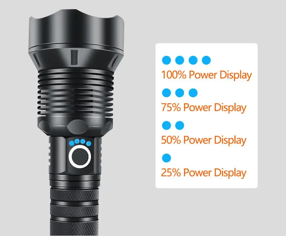 ★Светодиодный светильник: XHP90.2★3 режима: High-Low-SOS★Материал: алюминиевый сплав★Переключатель: нажмите переключатель★Режим зарядки: зарядка через USB★Расстояние освещения: выше 350 метров★Светодиодный срок службы: более 100000 часов★Аккумулятор: 2*18650/2*26650(Не входит в комплект)