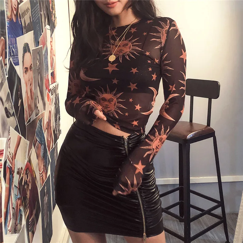 Футболка женская с принтом Sun Moon, прозрачная сетчатая пикантная ...