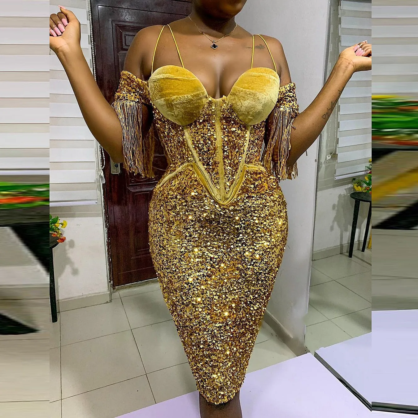 Вечернее платье-Русалка с открытыми плечами, бархатное платье с блестками и кисточками