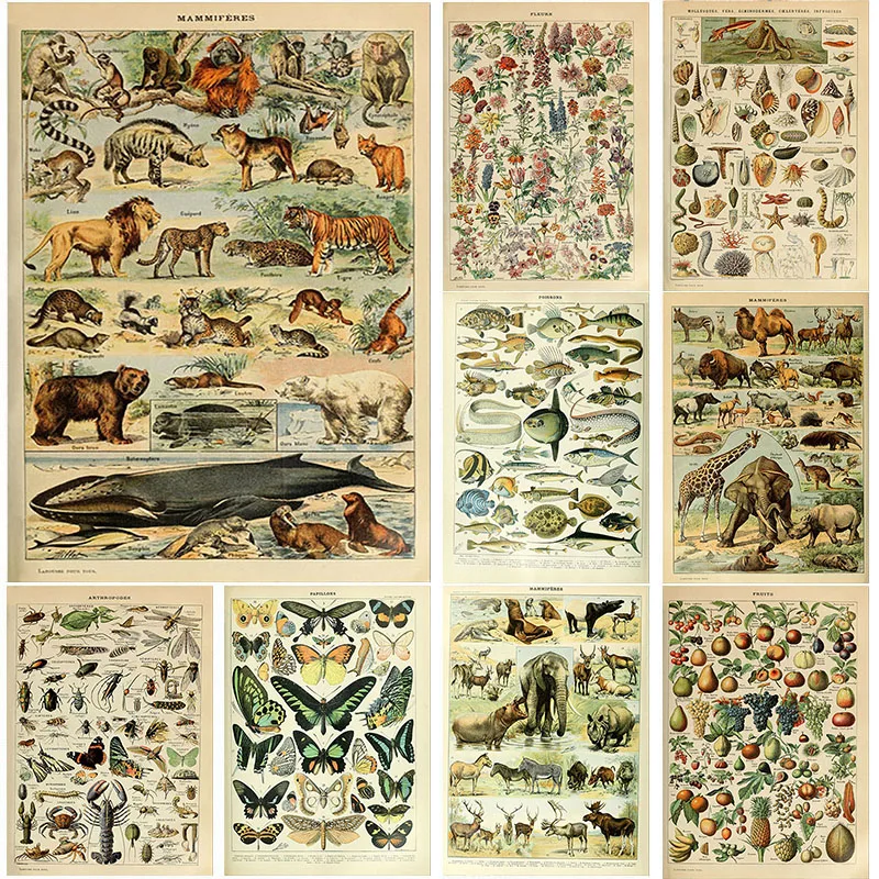 Классическая крафт-бумага, печать шампиньонов, инсекты, флаурс, ракообразные животные, растение, иллюстрация, постер для домашнего декора, детский подарок