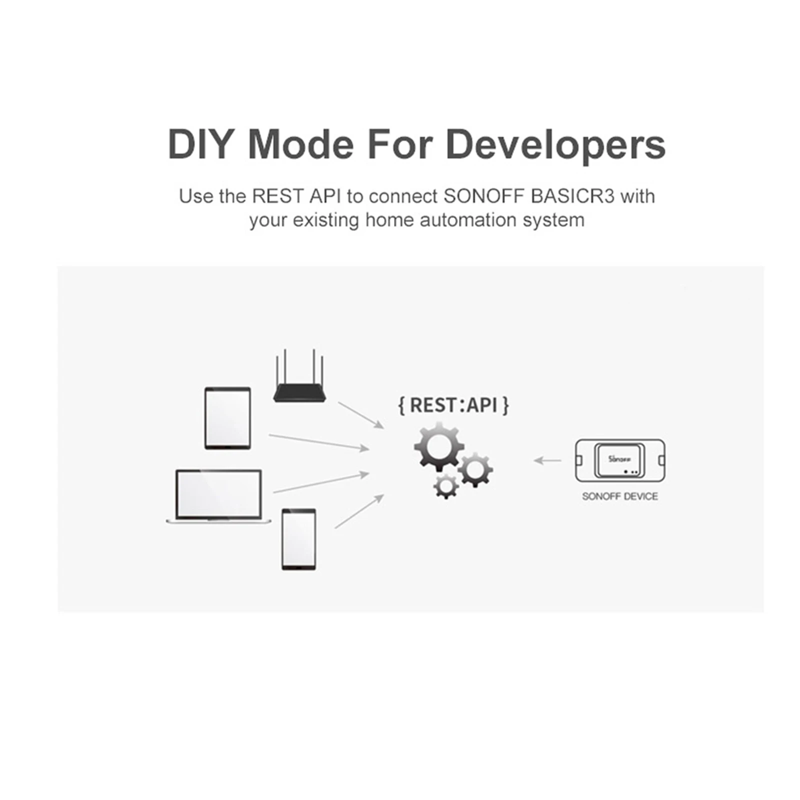 Примечание: у SONOFF BASICR3 нет модуля радиочастотного приемника 433 МГц. Если вы хотите умный переключатель diy с функцией RF, пожалуйста, купите SONOFF RFR3. Обзор: Это смарт-переключатель Wi-Fi с возможностью DIY, который позволяет управлять подключенными устройствами через eWeLink непосредственно с вашего телефона в любое время в любом месте, и он может предоставить вам удивительный опыт управления умным домом. Удивительно, что он имеет режим DIY, который является прошивкой, может быть определен пользователем. Встроенный веб-сервер, который предоставляет остальные API, что позволяет подключать коммутатор с существующей системой домашней автоматизации. Совместим с функцией IFTTT, и вы можете совершать больше действий для запуска других устройств или получать уведомление на вашем телефоне, как только действие было запущено. Share control позволяет управлять одним и тем же устройством вместе с семьей или друзьями, просто поделитесь им в приложении eWeLink, чтобы попробовать. Особенности: * Управление устройствами с телефона, в любом месте и в любое время. * Поддержка Amazon Alexa и Google Assistant для включения/выключения устройств. * Включите/выключите одно устройство или группы устройств. * Управляйте устройствами SONOFF с использованием поддерживаемых приложений и услуг IFTTT. * Режим DIY позволяет использовать остальные API для подключения SONOFF BASICR3 с вашей существующей системой домашней автоматизации. * Включите/Выключите устройство, когда нет доступа Wi-Fi в режиме локальной сети. * Поделитесь устройствами с семьей, чтобы управлять вместе. * Покажите статус в реальном времени в приложении eWeLink для устройств. * Можно подключить старый телефон, чтобы он контролировал и управлял устройствами. Характеристики: Модель: BASICR3 Источник питания: 100-240 В переменного тока Максимальный ток: 10A Максимальная мощность: 2200 Вт Банда: 1 Режим передачи: Wi-Fi связь Беспроводной Стандартный: 802,11 b/g/n, 2,4 ГГц Режим управления: мобильное приложение Платформа: для Android, iOS Расстояние управления: Бесконечность Материал корпуса: PC V0 Размер: 91*43*25 мм (Д * Ш * В) Посылка: 1 * Переключатель SONOFF BASICR3 1 * набор крепежных винтов