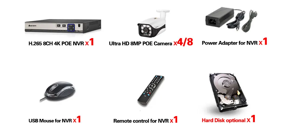 1 X 8-канальный сетевой видеорегистратор 4K POE NVR;4/8 X HD POE IP 8 Мп, Наружные камеры дневного и ночного видения с защитой от атмосферных воздействий;1 блок питания для сетевого видеорегистратора;1 USB-мышь для сетевого видеорегистратора;1 компакт-диск с программным обеспечением для сетевого видеорегистратора;1 х пульт дистанционного управления для сетевого видеорегистратора;Жесткий диск опционально!