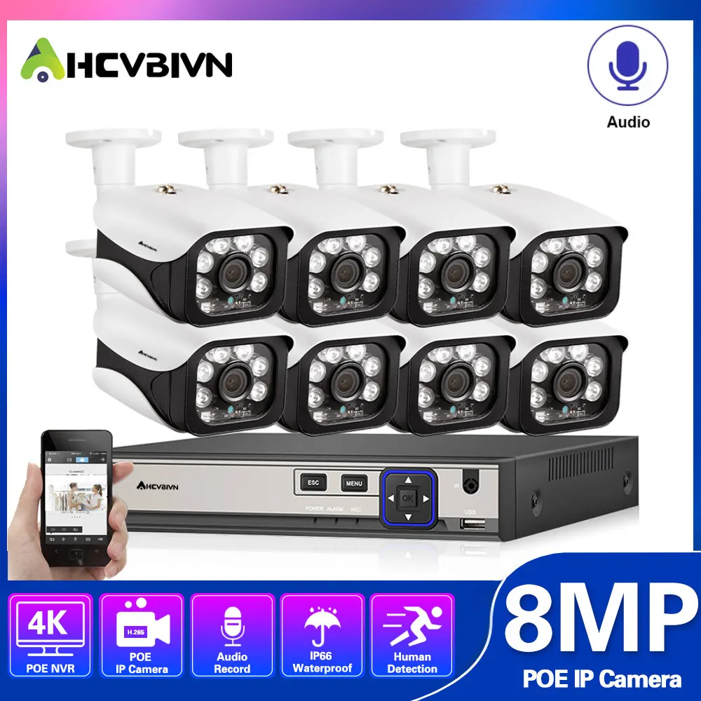 4K H.265 + 8CH 8MP POE Система видеонаблюдения комплект аудиозаписи Rj45 IP камера наружная Водонепроницаемая CCTV видеонаблюдения NVR набор