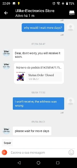 Продавец воровал, отправил на неправильный адрес, я открывал спор, но отказался вернуть деньги, даже со всеми показаниями, которые не прибыли на мой адрес. Поддержка AliExpress настаивала на том, что продукт ожидает вывода, который даже не был в моем состоянии. Стояло в Сан-Паулу и am Guanambi-ba. Определенно, чем хуже и хуже опыт, который был на месте. Не рекомендуется.