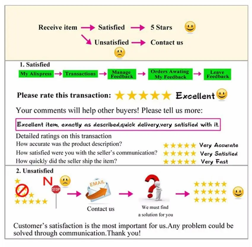 1. Если вы выбираете способ доставки: Yanwen Economic Air Mail или Почта Китая Обычная Маленькая посылка plus, она не может предоставить информацию для отслеживания за рубежом, пожалуйста, не волнуйтесь, он будет успешным в вашей стране, и его процент потери пакета очень низок. В этих заказах мы не принимаем Никаких споров, не отслеживая номер.2. Если вы хотите отслеживать информацию проекта в реальном времени и вам срочно нужен продукт, пожалуйста, выберите ePacket, China Post Air Mail, aliexpress Standard Premium shipping Special Line-YW или другие веревки, такие как DHL, EMS, UPS и т. д.3. Если они имеют дело с нашим временем доставки, пожалуйста, не начинайте обсуждение легко, их понимание высоко ценится.4. Мы рады помочь им решить любую проблему, пожалуйста, свяжитесь с нами, прежде чем давать нам негативные отзывы.5. Мы предлагаем дропшиппинг и оптовую продажу, не связавшись с нами, мы хотели бы долгосрочные деловые отношения с ними.6. Их утверждение-наше предложение. Большое спасибо за поддержку.Возврат и возврат и повторная отправка1. Если есть какие-либо проблемы с нашим продуктом, вы можете запросить возврат или возврат в течение 7 дней после получения товаров. Пожалуйста, свяжитесь с нашей службой поддержки клиентов, прежде чем вернуть или открыть спор против нас.2. Все товары должны быть возвращены в их первоначальном состоянии, или мы откажемся от возврата. Покупатель несет ответственность за все расходы, возникшие в процессе возврата.3. Если вы получили поврежденные или неправильные товары, пожалуйста, отправьте нам посылка и фото товара немедленно, тогда мы отправим вам повторно или вернем вам деньги.